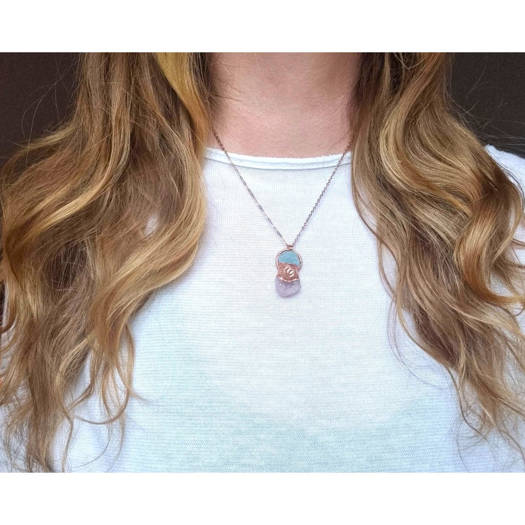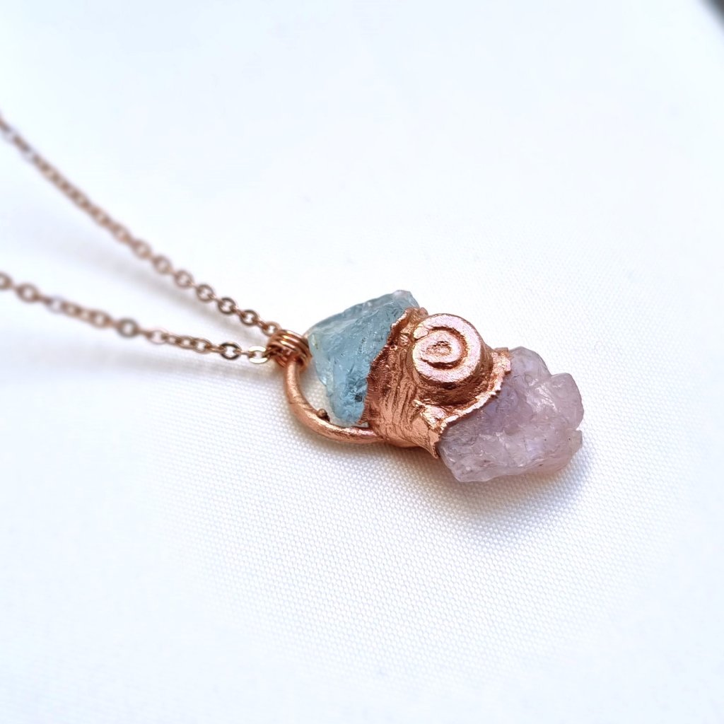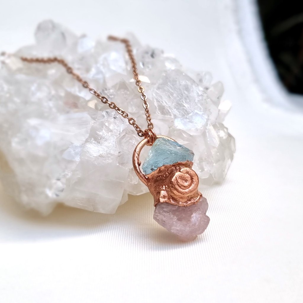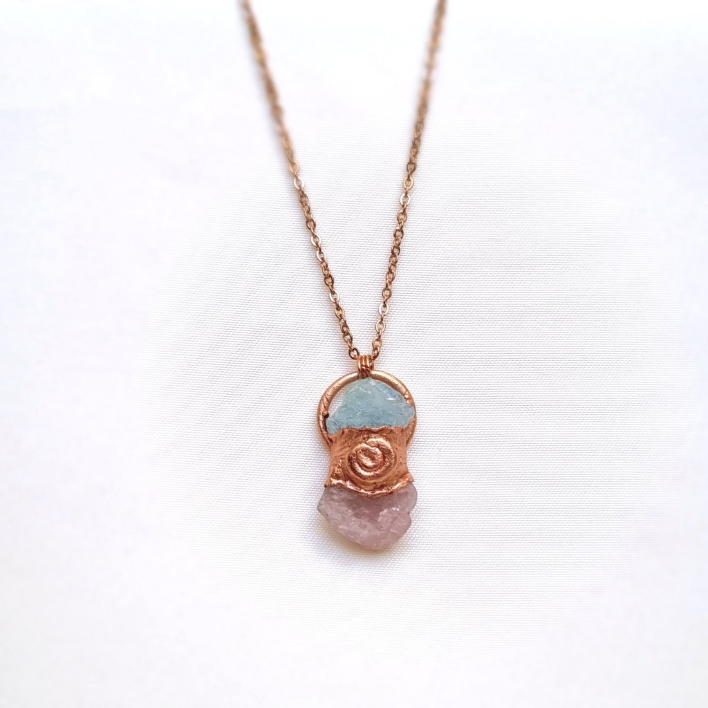 Měděný přívěsek se surovými přírodními krystaly berylu - akvamarín blankytně modré barvy a morganit světle růžové barvy. Šperk má velmi něžnou hladivou energii a oba krystaly se dokonale doplňují v harmonické souhře.