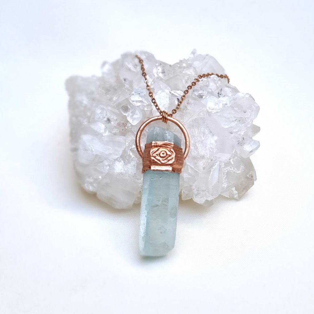 Měděný přívěsek s nádherným přírodním akvamarínem blankytně modré barvy, zakončeným katedrálovou strukturou v horní části.