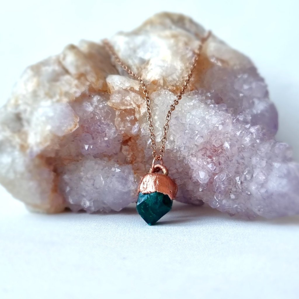 Tento autorský šperk zdobí přírodní krystal dioptasu z Konga, minerál proslulý svou intenzivní, sytě zelenou až smaragdovou barvou a výjimečným leskem. Dioptas patří mezi vizuálně nejvýraznější minerály světa – jeho barva je hluboká, zářivá a nepřehlédnutelná. Dioptas je minerál, který v sobě nese jakousi tajemnou magii. Nevede nás cestou povrchu, ale hluboko dovnitř. Rozvibrovává srdce do frekvence hlubokého poznání a soucitu. Otevírá brány k vnímání jemněhmotného světa, k propojení s přírodou i s vesmírnými silami.