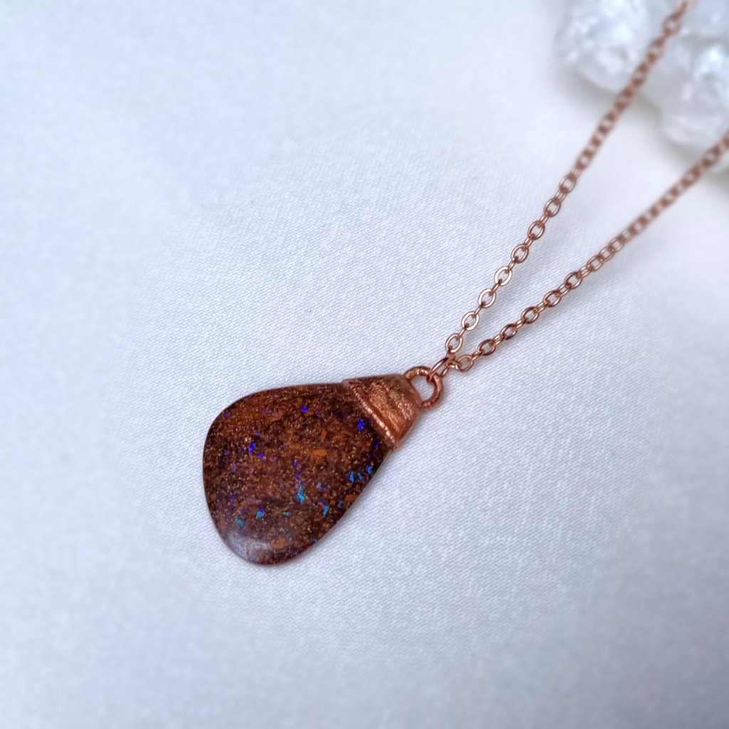 Přírodní jiskřivý australský boulder opál – nekonečný tanec světla a energie! Obklopte se nádhernou hrou barev vzácného australského boulder opálu, jehož fialové, modré, tyrkysové a zelené odlesky se mění s každým pohybem. Tento jedinečný šperk ve vás zažehne životní jiskru, je to taková nekonečně proudící fontána energie, která vás zahalí do radosti a světla. Opál hraje několika barvami, což se bohužel špatně zachycuje na fotografii - převažuje modrá, fialová, tyrkysová a zelená (záleží na úhlu pohledu a prostupování světla). Opál prostupuje skrz na skrz mateční horninou. Boulder opál je vzácný druh opálu, který se nachází především v Austrálii, kde vzniká v trhlinách železitých hornin. Energeticky podporuje uzemnění, sebedůvěru, harmonii, kreativitu a spojení s přírodou díky svému spojení s mateřskou horninou.