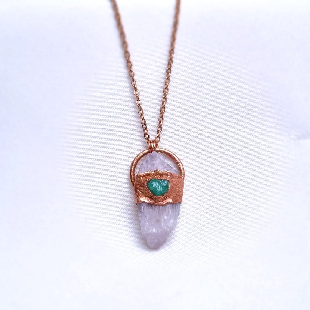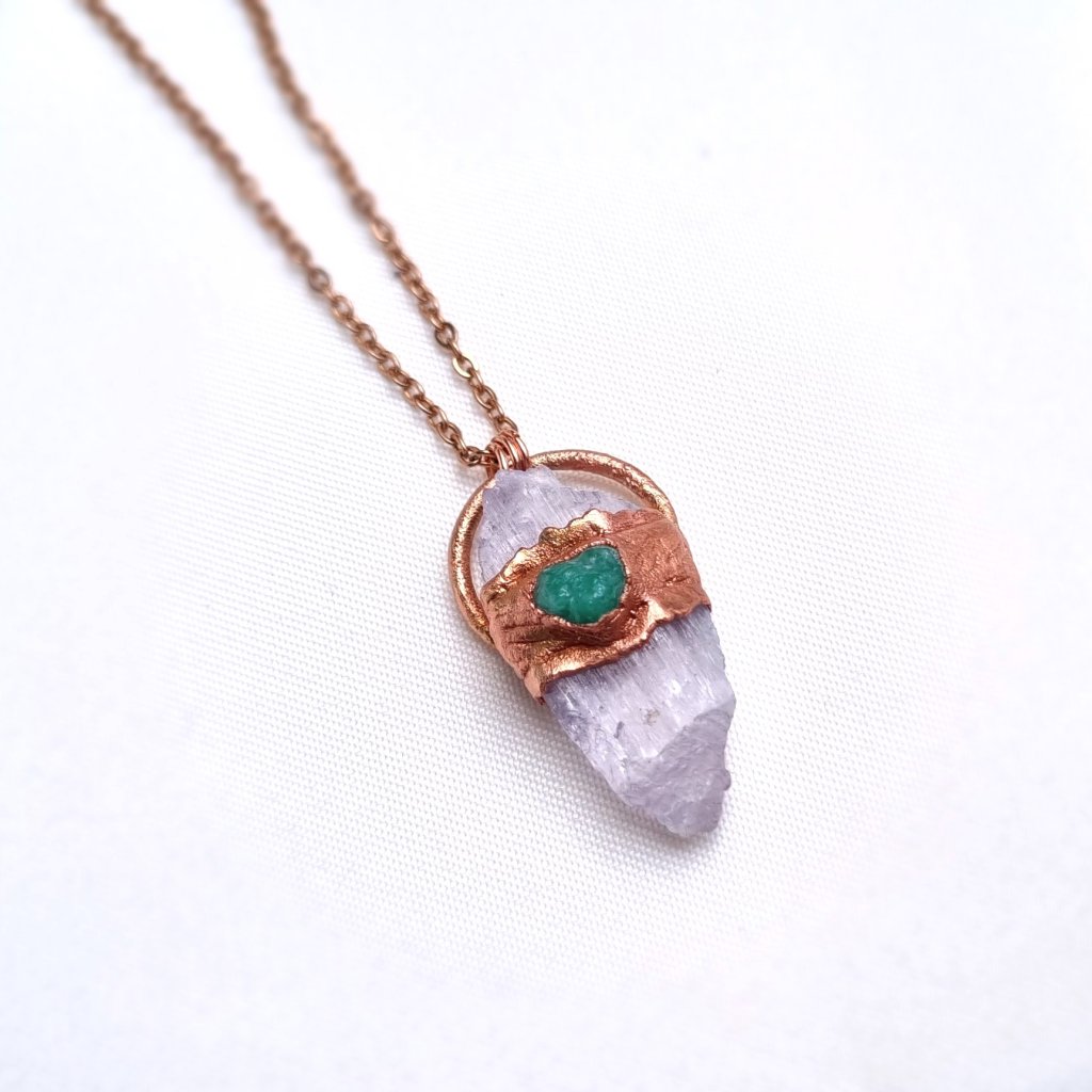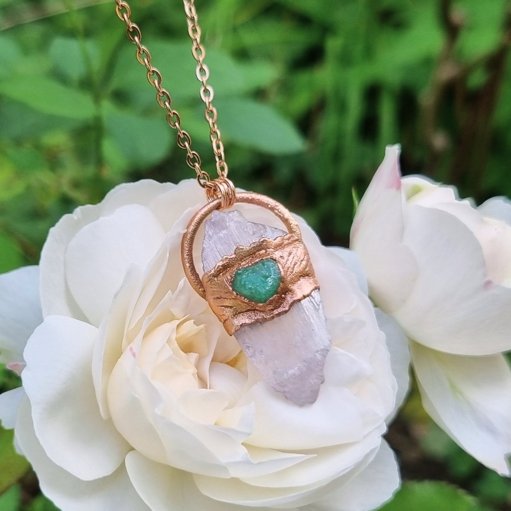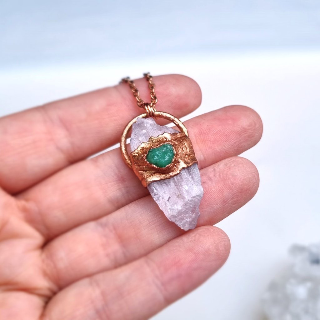 Šperk s kunzitem a smaragdem – spojení něhy a síly - tento jedinečný autorský šperk tvoří přírodní krystaly oboustranně přirozeně ukončeného jemně růžového kunzitu a jasně zeleného smaragdu z panenské přírody Pakistánu. Jejich energie se vzájemně doplňují – kunzit přináší klid, něhu a jemnost, zatímco smaragd je kamenem životní síly, harmonie a otevřeného srdce. Společně tvoří talisman čisté lásky a radosti, která je zároveň jemná i mocná. Šperk je jako dotek přírody, který propojuje něžnou ženskost s pevností a odvahou – připomíná, že srdce je nejsilnějším kompasem na cestě životem.