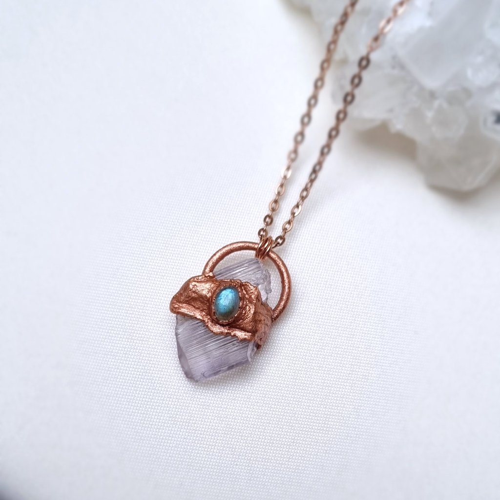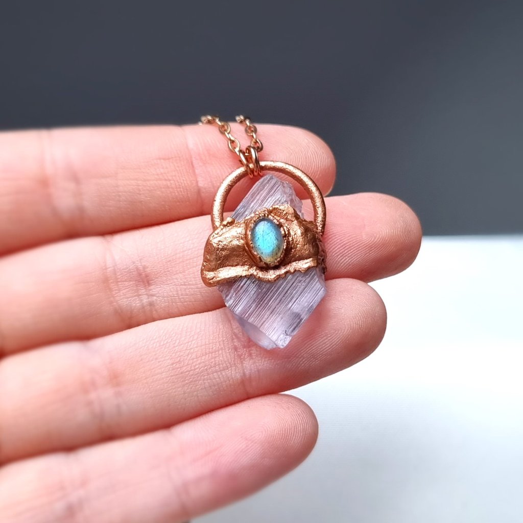 Kunzit září jemným růžovým až levandulovým tónem s krystalickou průzračností, zatímco labradorit zrcadlí světlo v hypnotickém spektru tyrkysově modrých odlesků – je to setkání éterického s pozemským, ženské něhy s energií hvězd.