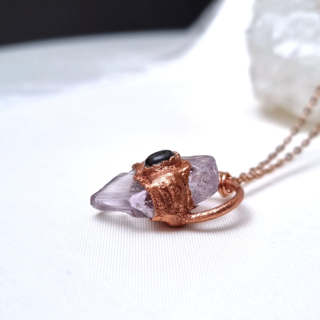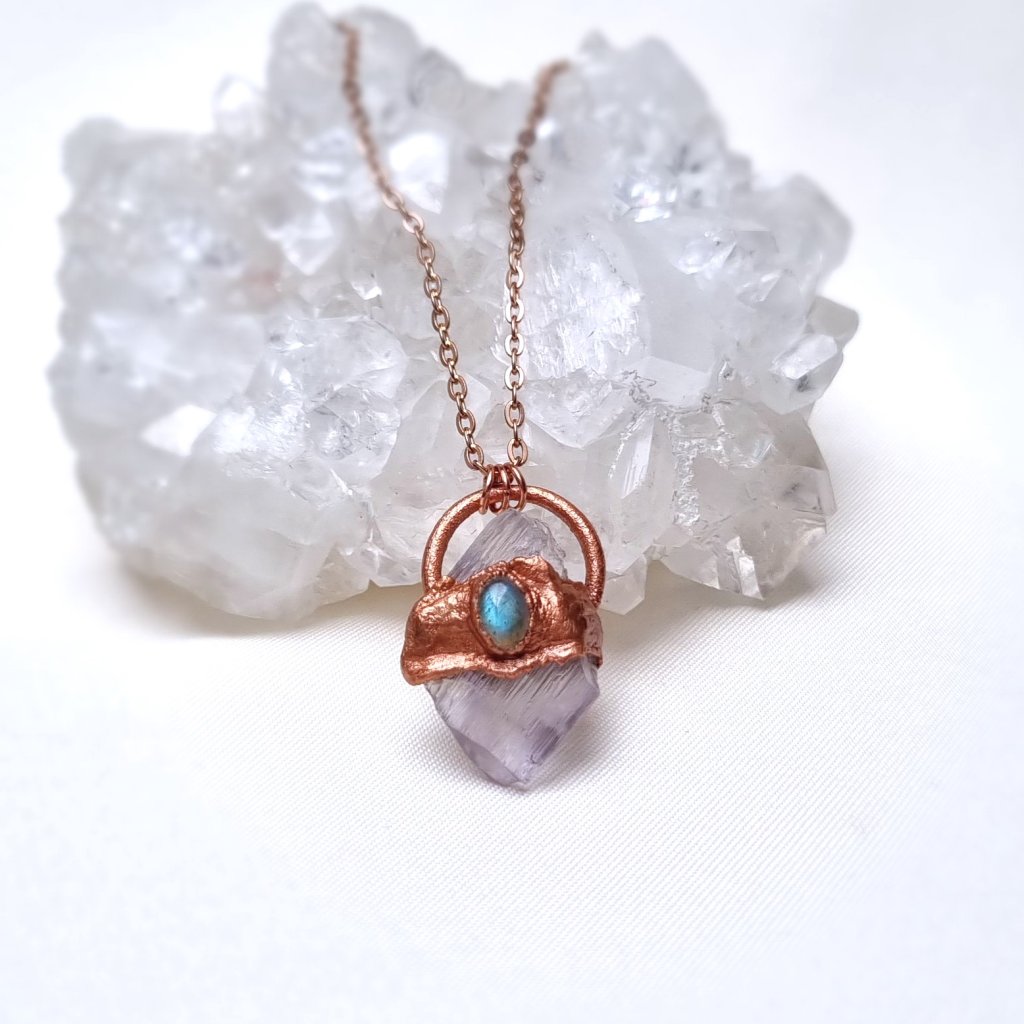 Tento autorský šperk propojuje dvě esence kontrastních, a přesto dokonale souznících světů – růžovo-fialový kunzit, kámen jemnosti, něžnosti a čistoty srdce, a tyrkysově modrý labradorit - kámen tajemství, proměny a světelné hloubky. Jejich spojení vytváří jedinečnou hru světla – šperk, který mění odstíny podle dopadu paprsků, jako by v sobě nesl hned několik příběhů zároveň.