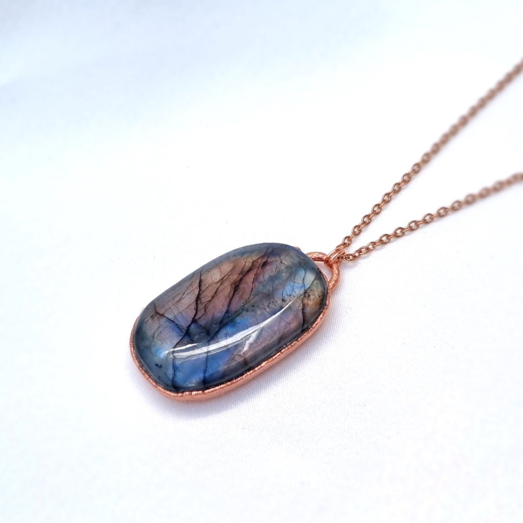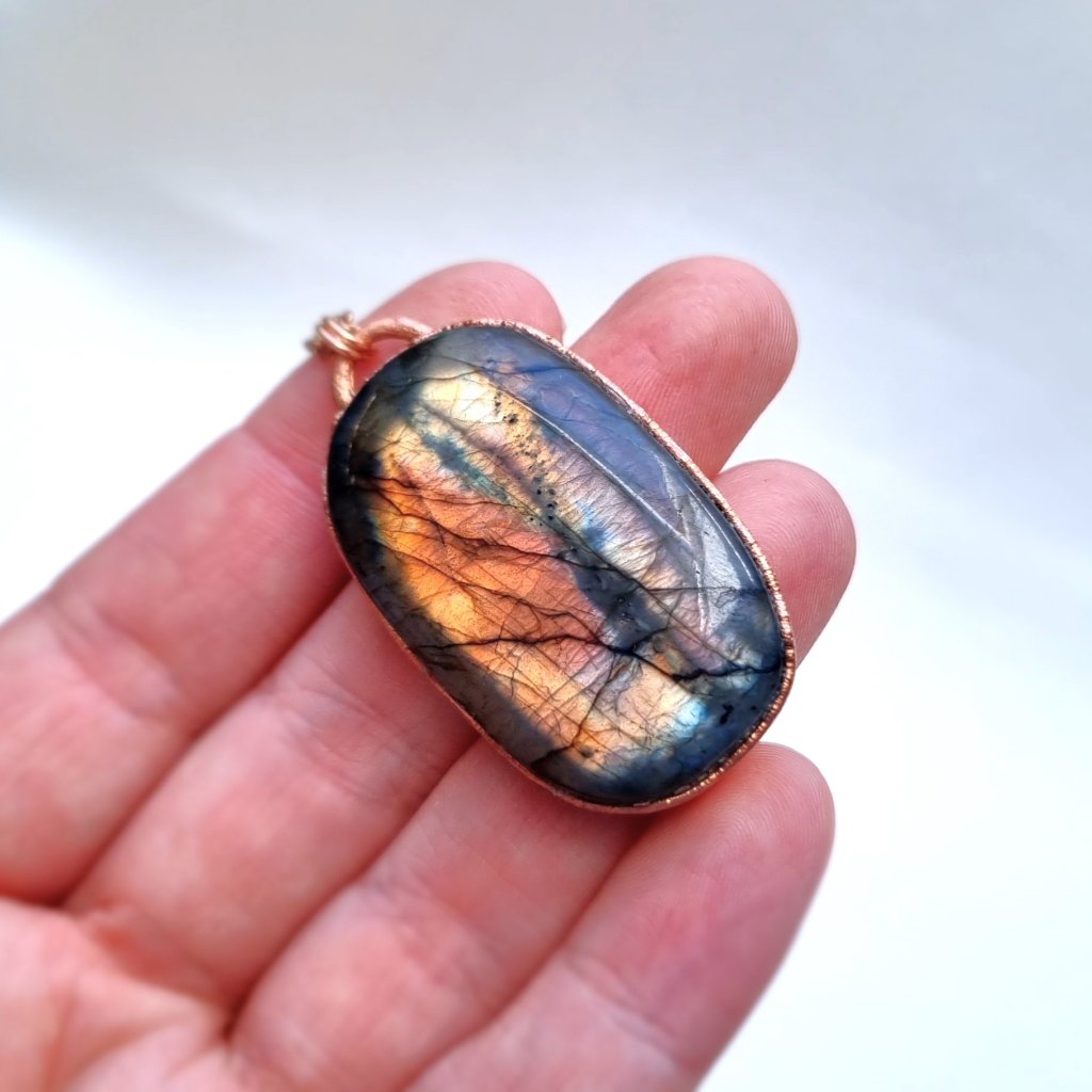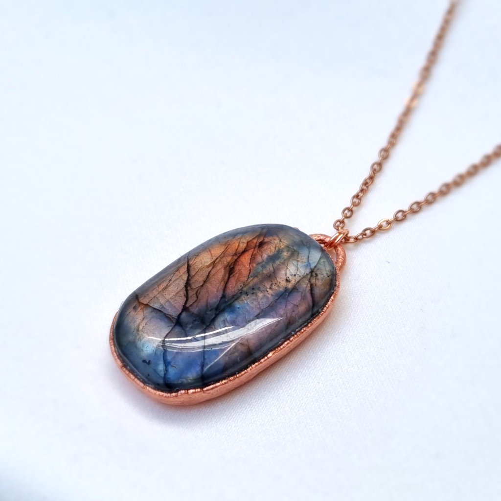 Měděný přívěsek s přírodním labradoritem broušeným do tvaru kabošonu. Tento jedinečný labradorit vás okouzlí svou proměnlivou hrou barev – od teplých oranžových a žlutých tónů po mystickou fialovou, místy dokonce modrou barvu. Energeticky je labradorit často označován jako „kámen magie“, protože jeho hra barev symbolizuje schopnost vidět věci v širších souvislostech.