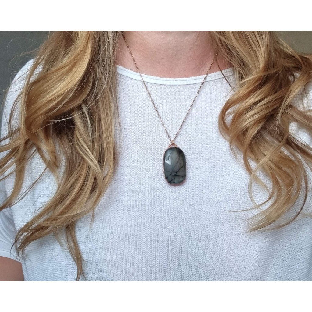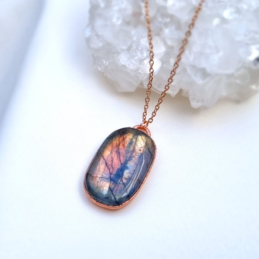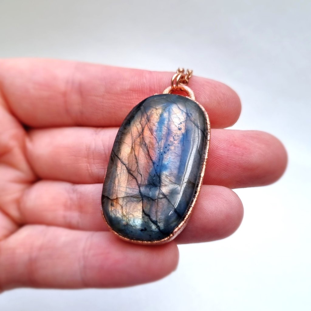 Měděný přívěsek s přírodním labradoritem broušeným do tvaru kabošonu. Tento jedinečný labradorit vás okouzlí svou proměnlivou hrou barev – od teplých oranžových a žlutých tónů po mystickou fialovou, místy dokonce modrou barvu. Energeticky je labradorit často označován jako „kámen magie“, protože jeho hra barev symbolizuje schopnost vidět věci v širších souvislostech.