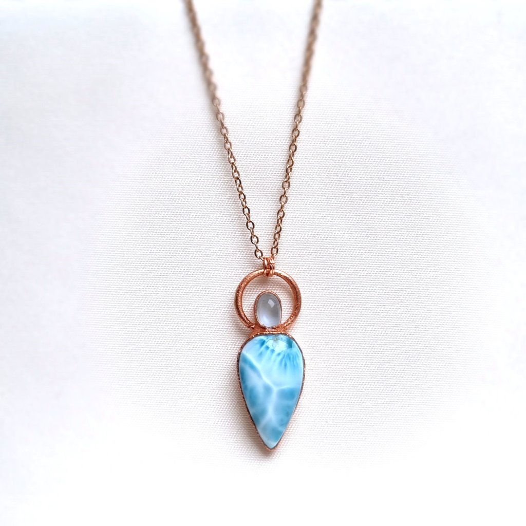 Larimar a měsíční kámen spolu tvoří kompozici, která připomíná hluboký nádech u moře za svitu měsíce.