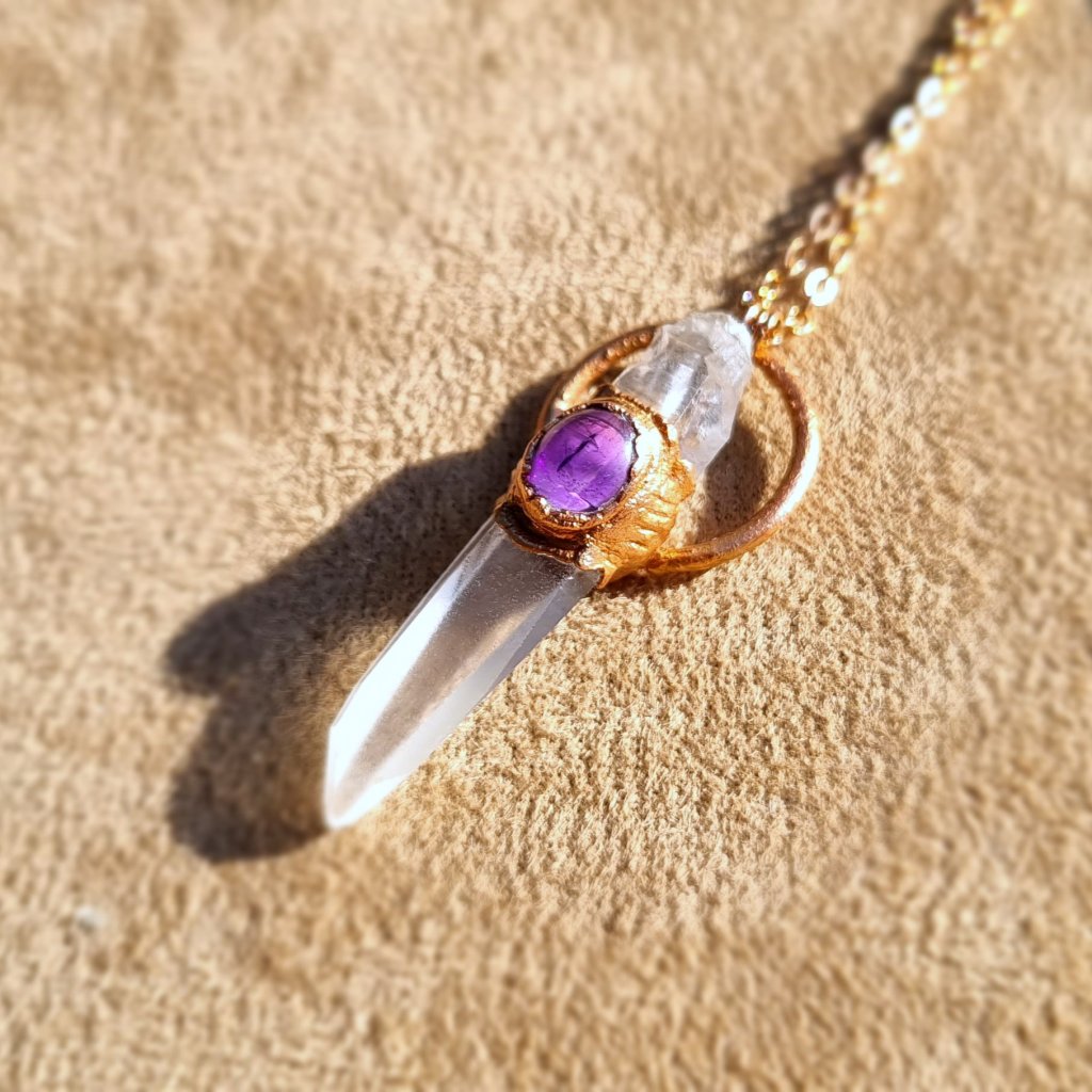 Šperk z lemurského křišťálu a ametystu – spojení moudrosti a ochrany. Tato kombinace spojuje čistotu pradávných vědění Lemurie s klidnou, ochrannou energií ametystu. Společně vytvářejí harmonii, která podporuje duchovní růst, intuici i vnitřní sílu. Lemurský křišťál je přírodní, oboustranně ukončený a s otiskem jiného krystalu, tzv. klíče (otisk vznikl při růstu krystalu). Ametyst je přírodní - vybroušený. Ametyst má sytě fialovou barvu, při prosvícení či na slunci (viz foto č. 2) je barva jasná a živá, s drobnou inkluzí - jakoby připomínal oko.