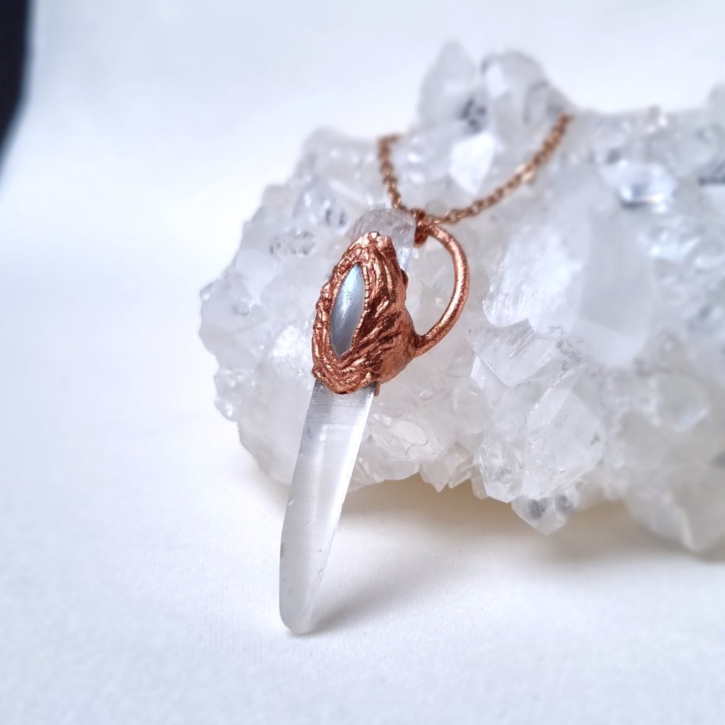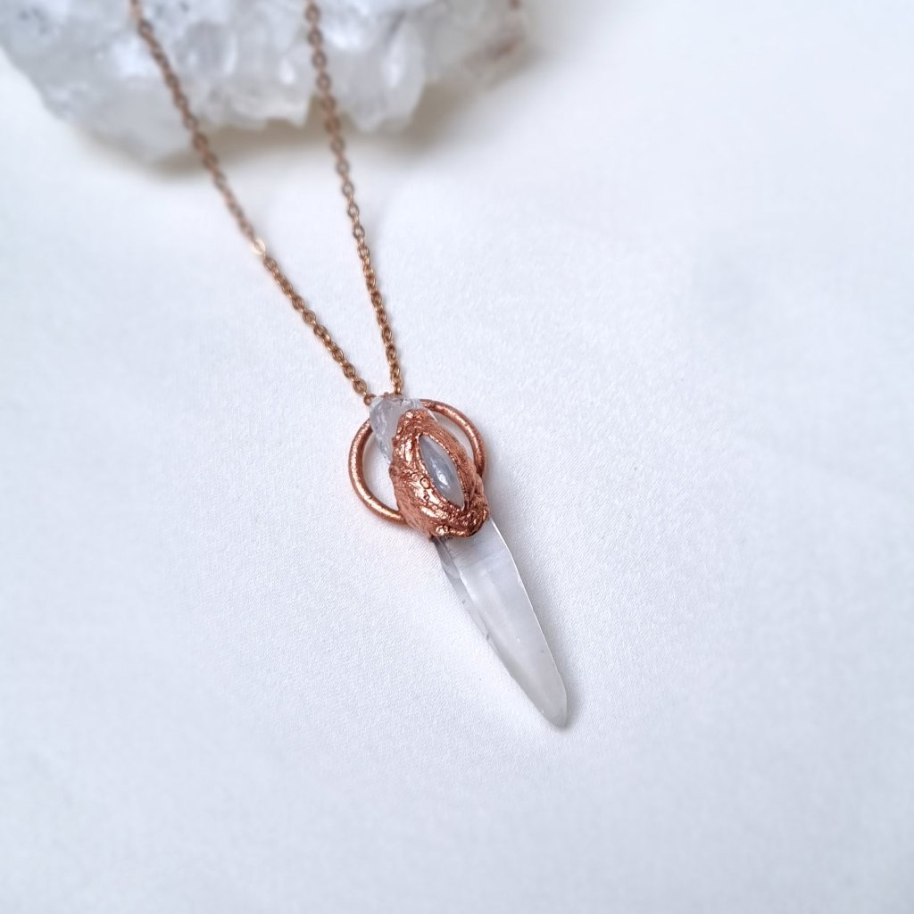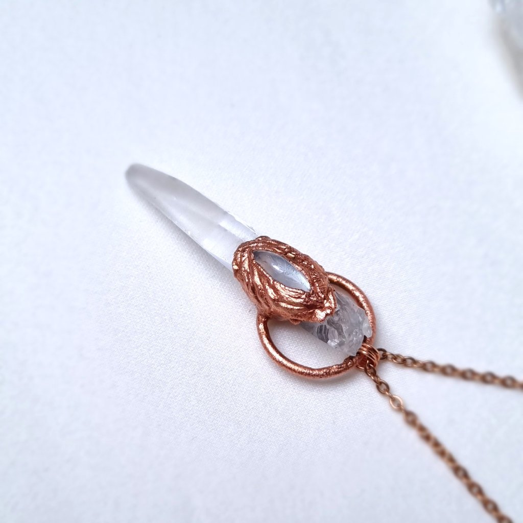 Měděný přívěsek s výjimečným přírodním krystalem lemurského křišťálu a perleťovým měsíčním kamenem ze Srí Lanky. Křišťál je výjimečný tím, že je tzv. ,,Klíčem" - nese v sobě klíčové otisky jiného krystalu (tyto otisky jsou přírodního původu, vznikly když rostlo více krystalů zároveň). Je to velmi vhodný nástroj pro meditaci, kdy napomáhá na povrch vytahovat to, co se často snaží zůstat skryto. Rozklíčuje danou situaci a dopomůže najít řešení. Na energetické úrovni působí jako klíč, který odemyká skrytý potenciál. Lemurský křišťál pochází z Brazílie, měsíční kámen z mystické Srí Lanky.