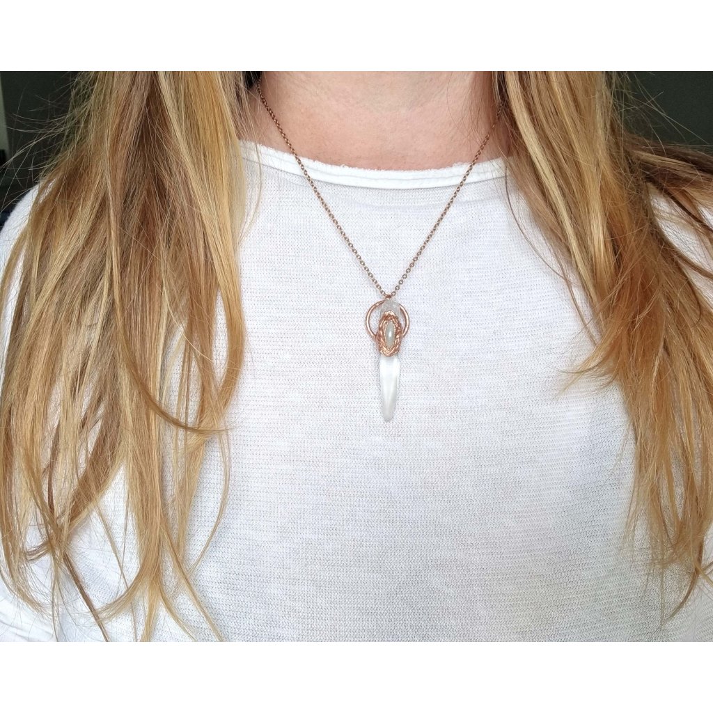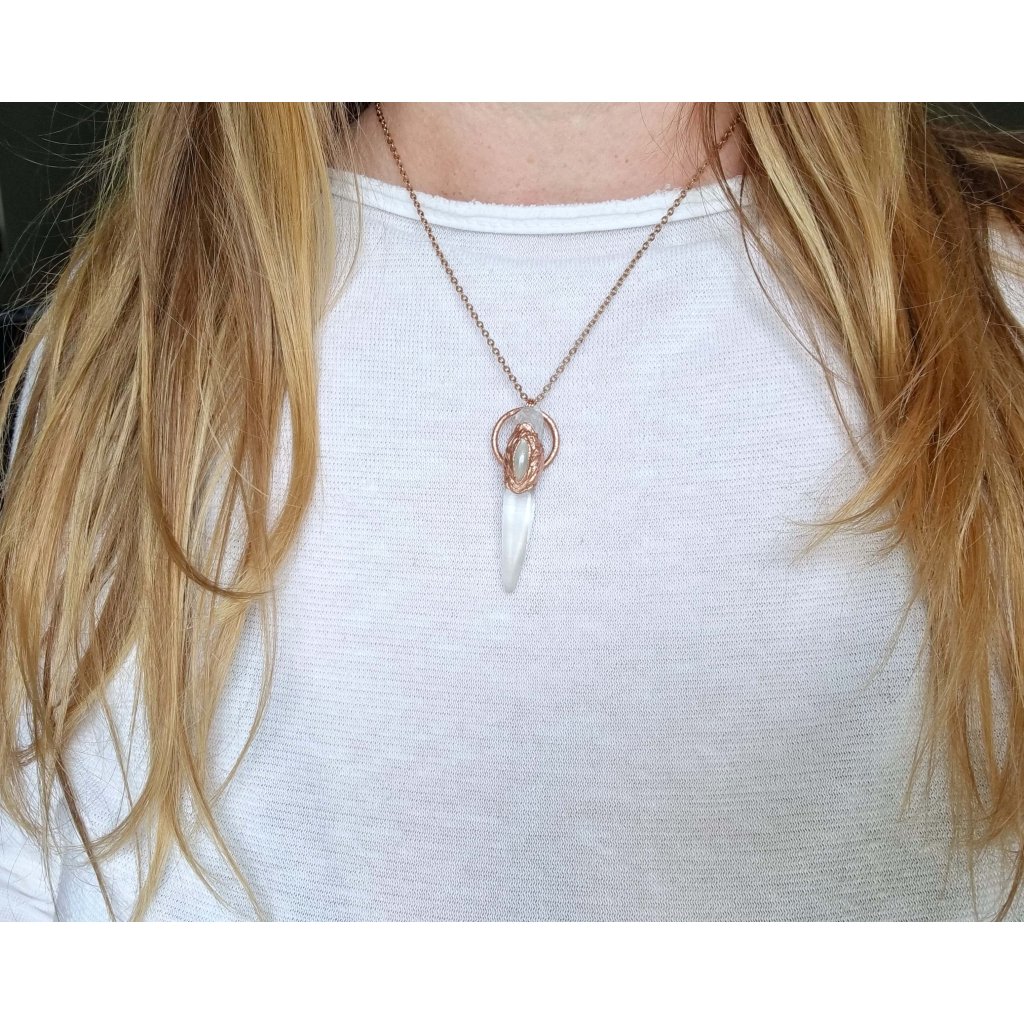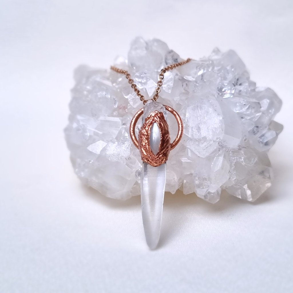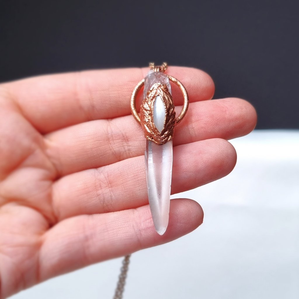 Měděný přívěsek s výjimečným přírodním krystalem lemurského křišťálu a perleťovým měsíčním kamenem ze Srí Lanky. Křišťál je výjimečný tím, že je tzv. ,,Klíčem" - nese v sobě klíčové otisky jiného krystalu (tyto otisky jsou přírodního původu, vznikly když rostlo více krystalů zároveň). Je to velmi vhodný nástroj pro meditaci, kdy napomáhá na povrch vytahovat to, co se často snaží zůstat skryto. Rozklíčuje danou situaci a dopomůže najít řešení. Na energetické úrovni působí jako klíč, který odemyká skrytý potenciál. Lemurský křišťál pochází z Brazílie, měsíční kámen z mystické Srí Lanky.