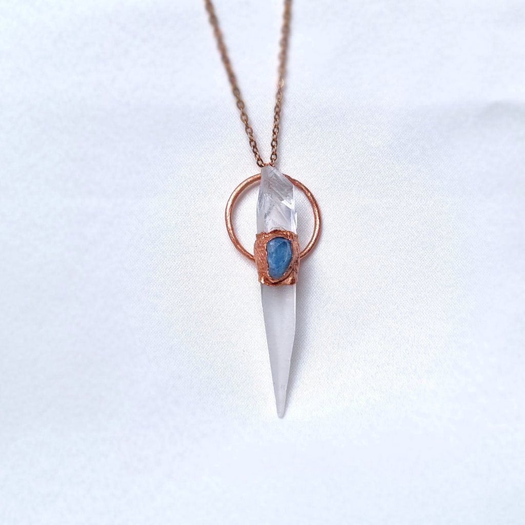 Tento šperk nese esenci světla a vody – spojení blankytně modrého akvamarínu a lemurského křišťálu - tzv. ,Klíče, dvou průvodců světelných bytostí a snících duší. Akvamarín hladí duši, tiší mysl, nese tě do hlubin vnitřního klidu. Lemurský křišťál - tento konkrétní, je výjimečný tím, že je tzv. ,,Klíčem" - nese v sobě klíčový otisk jiného krystalu. Je to velmi vhodný nástroj pro meditaci, kdy napomáhá na povrch vytahovat to, co se často snaží zůstat skryto. Rozklíčuje danou situaci a dopomůže najít řešení. Na energetické úrovni působí jako klíč, který odemyká skrytý potenciál. Přírodní otisk jiného krystalu, tak jak rostly společně, se nachází v horní části krystalu.