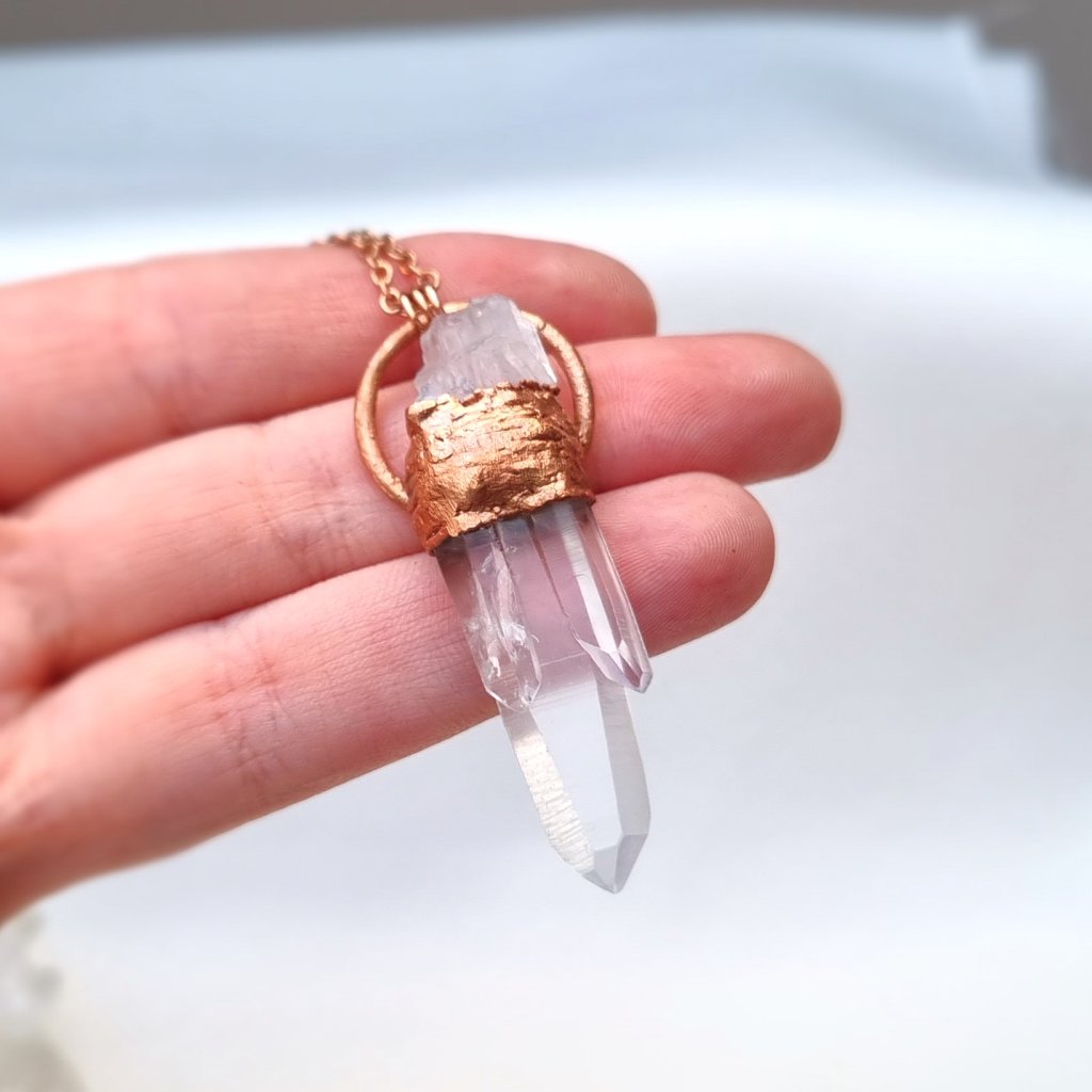 Měděný přívěsek s výjimečným přírodním troj-krystalem lemurského křišťálu. Krystal je výjimečný tím, že je tzv. ,,Klíčem" - nese v sobě klíčový otisk jiného krystalu. Je to velmi vhodný nástroj pro meditaci, kdy napomáhá na povrch vytahovat to, co se často snaží zůstat skryto. Rozklíčuje danou situaci a dopomůže najít řešení. Na energetické úrovni působí jako klíč, který odemyká skrytý potenciál.