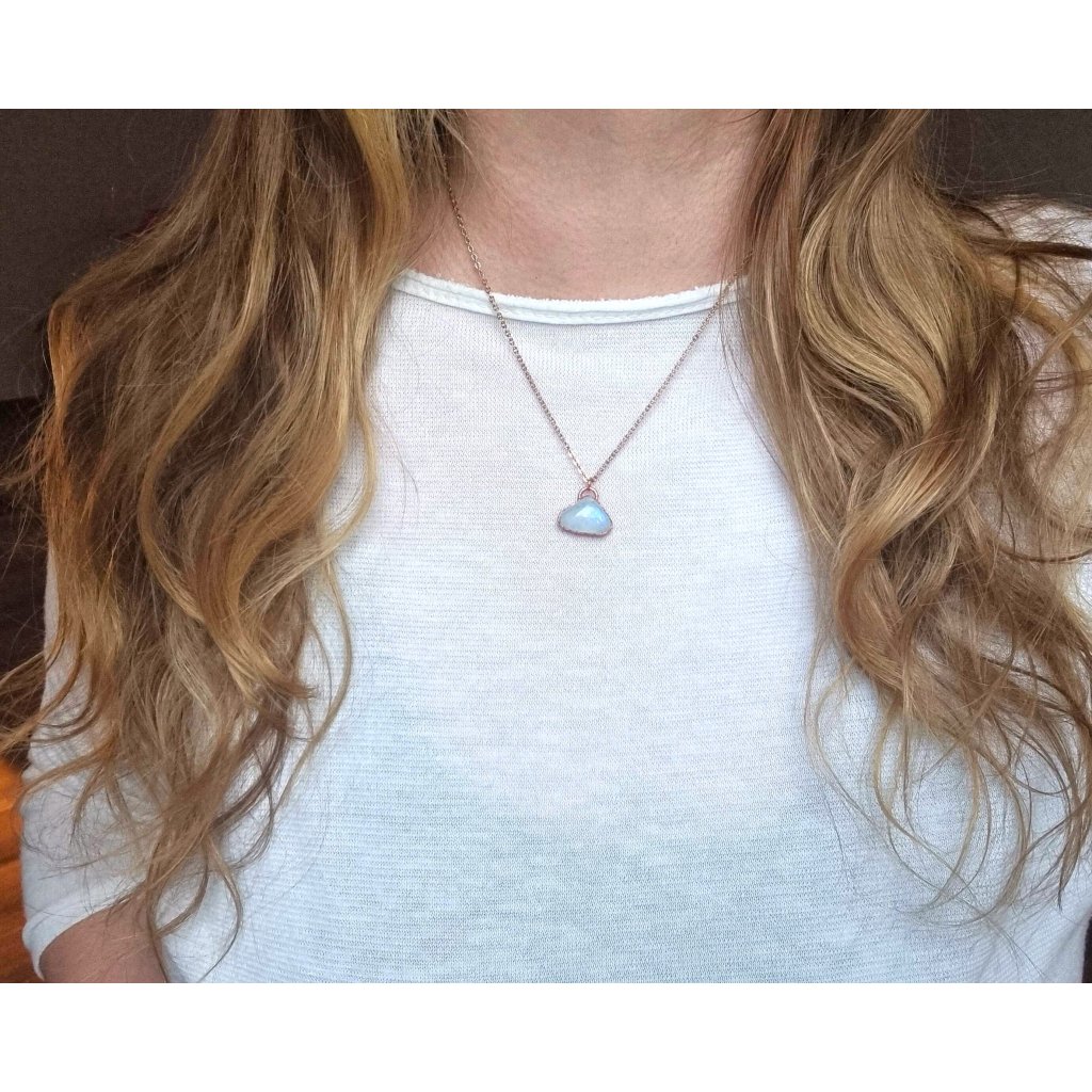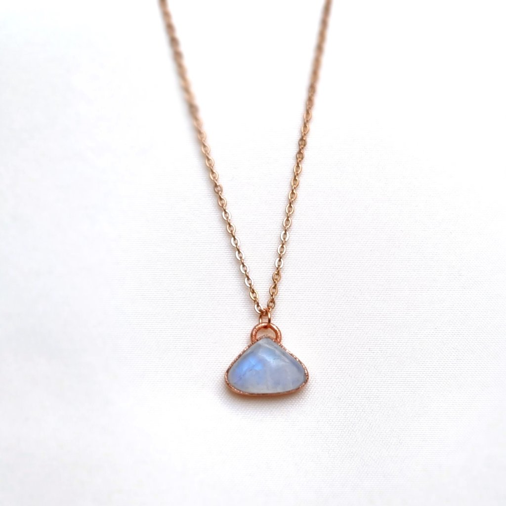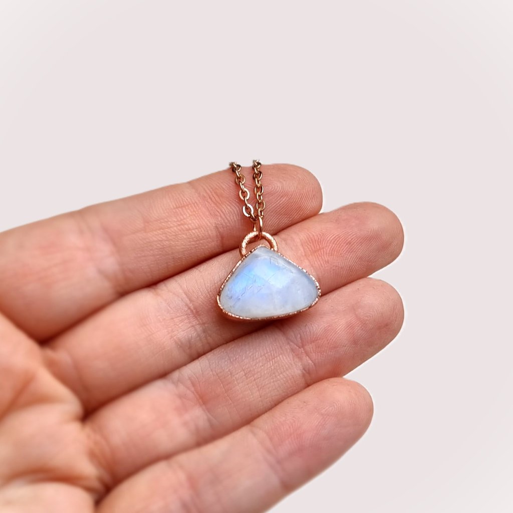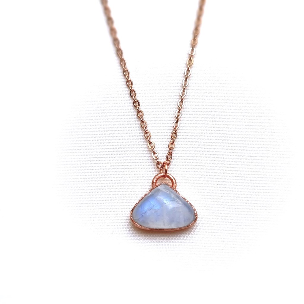 Měděný přívěsek s přírodním měsíčním kamenem (adulárem). Měsíční kámen hraje nádhernými odstíny modro-fialové a perleťové barvy a pochází ze Srí Lanky, oblasti Meetiyagoda. Kámen je leštěný, jeho přírodní struktura se však může projevit jemnými povrchovými liniemi (které nejsou prasklinami) či inkluzemi.