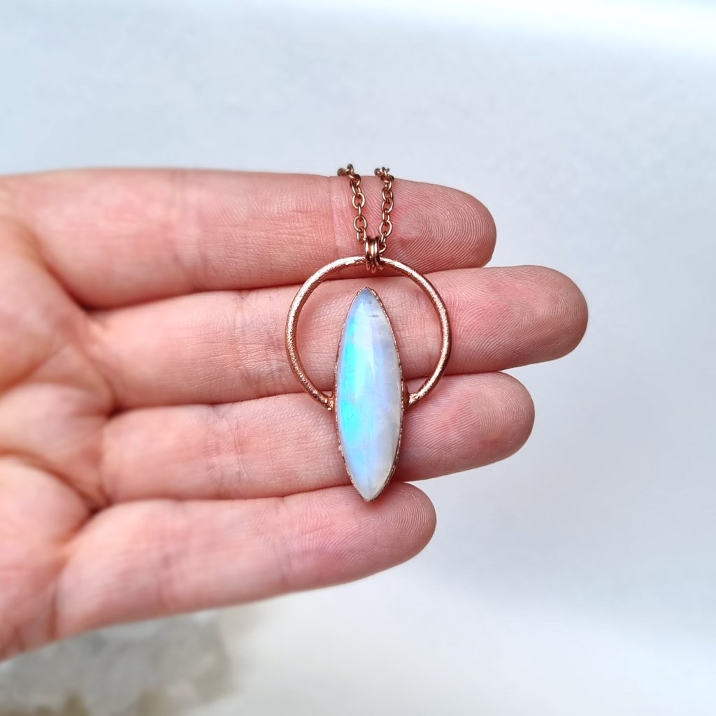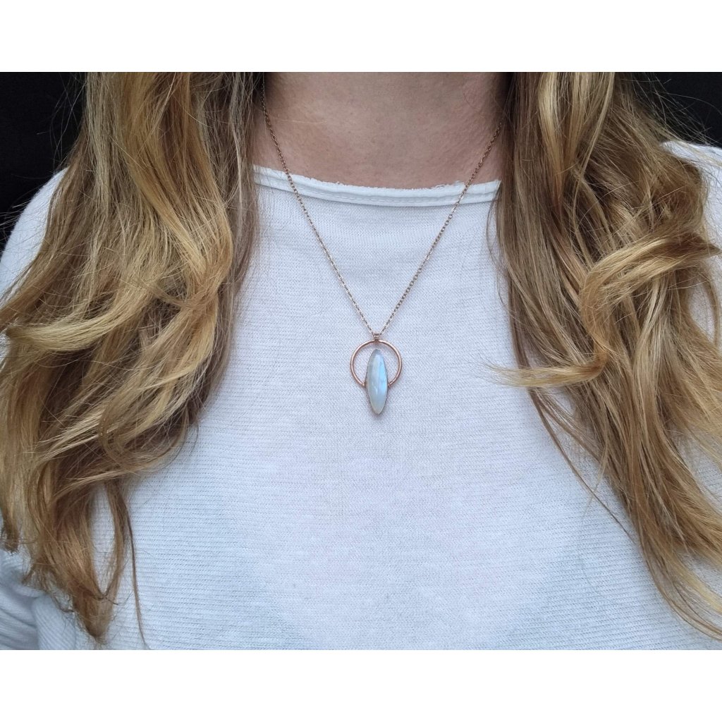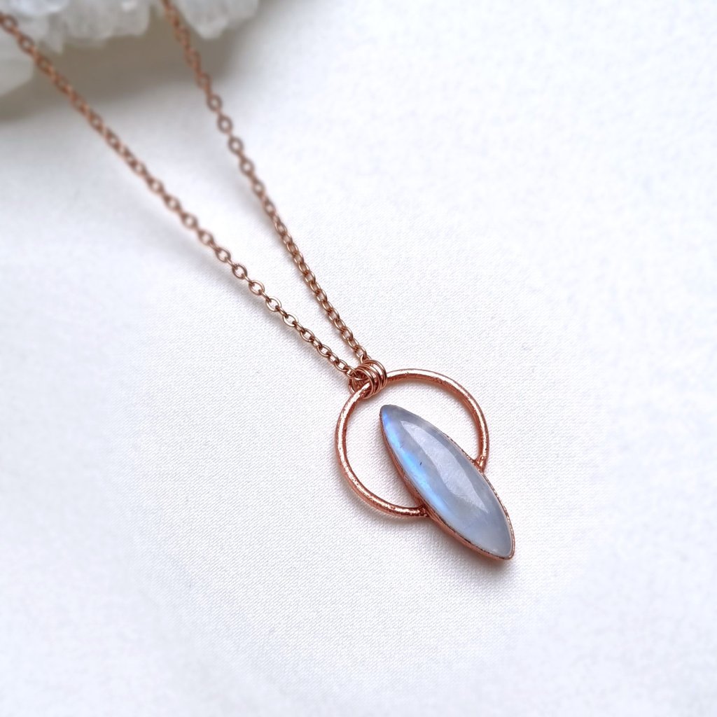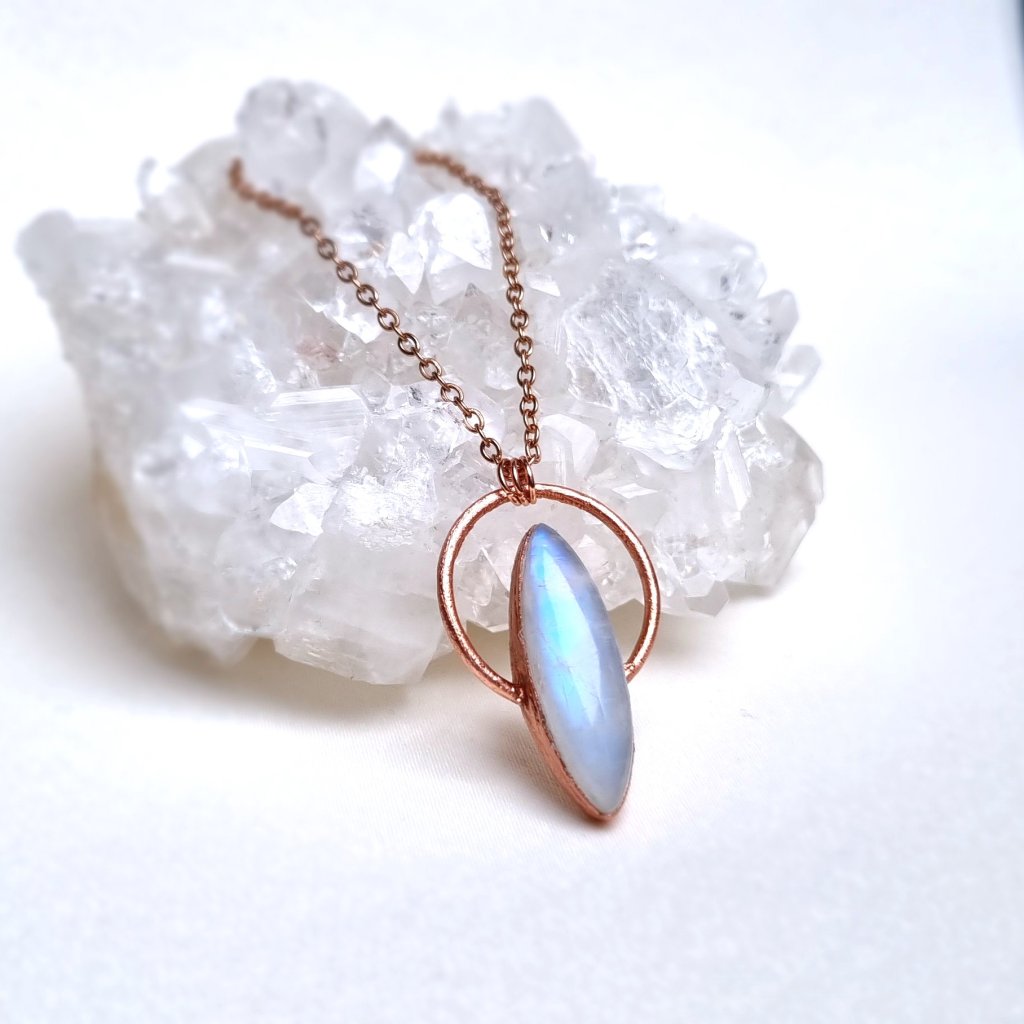 Tento šperk v sobě nese světlo měsíce ukryté v kameni – jemnou zář, která se proměňuje s každým pohybem. Měsíční kámen, od nepaměti spojovaný s bohyní Měsíce Seléné, symbolizuje intuici, proměnlivost a ženskou sílu. Jeho opalizující lesk připomíná tichý dotek měsíčního svitu na hladině vody. Měděný přívěsek s nádherným přírodním měsíčním kamenem (adulárem). Měsíční kámen hraje nádhernými odstíny modro-fialové a perleťové barvy a pochází ze Srí Lanky, oblasti Meetiyagoda.