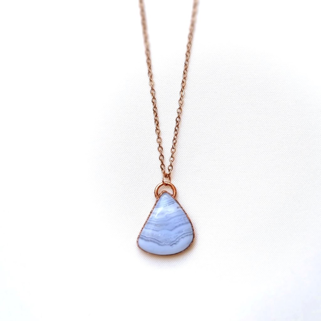 Modrý krajkový achát je kamenem jemnosti a přirozené elegance. Jeho charakteristická kresba připomíná lehkou krajku z jemných modrých linií, které se v kameni prolínají v měkkých vlnách. Tento ručně tvořený šperk nechává vyniknout přirozenou krásu přírodního modrého krajkového achátu, jehož kresba působí klidně, harmonicky a zároveň fascinujícím způsobem proměnlivě.