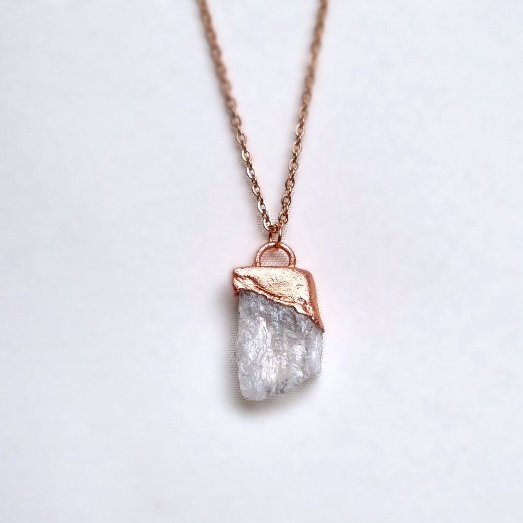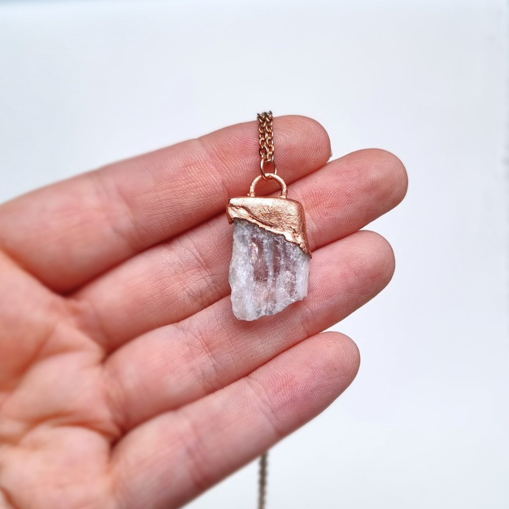 Měděný přívěsek s přírodním krystalem vzácného petalitu, známého pro své jemné, éterické vibrace a silné ochranné účinky. Petalit je vysoce ceněn mezi sběrateli i milovníky krystalové energie pro svou schopnost navozovat hluboký vnitřní klid, harmonizovat a posilovat spojení s vyšším vědomím. Často je nazýván "andělským kamenem", protože pomáhá při meditaci, duchovním růstu a práci se srdeční i korunní čakrou. Občas o něm můžete slyšet i jako o šamanském kameni. Pochází z Brazílie. Krystal je průzračný, s perleťovými odlesky.