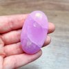Vzácný růžový aragonit broušený do tvaru hmatky - tak akorát do dlaně. Z jedné strany má po celé ploše nádhernou sytě růžovou barvu, z druhé strany je v kombinaci s mléčně zbarveným kalcitem. Aragonit je v top šperkové kvalitě. Růžový aragonit – kámen jemnosti, harmonie a duchovního růstu. Tento jemný kámen je spojován se srdeční čakrou, která je centrem lásky, soucitu a emocionální rovnováhy.