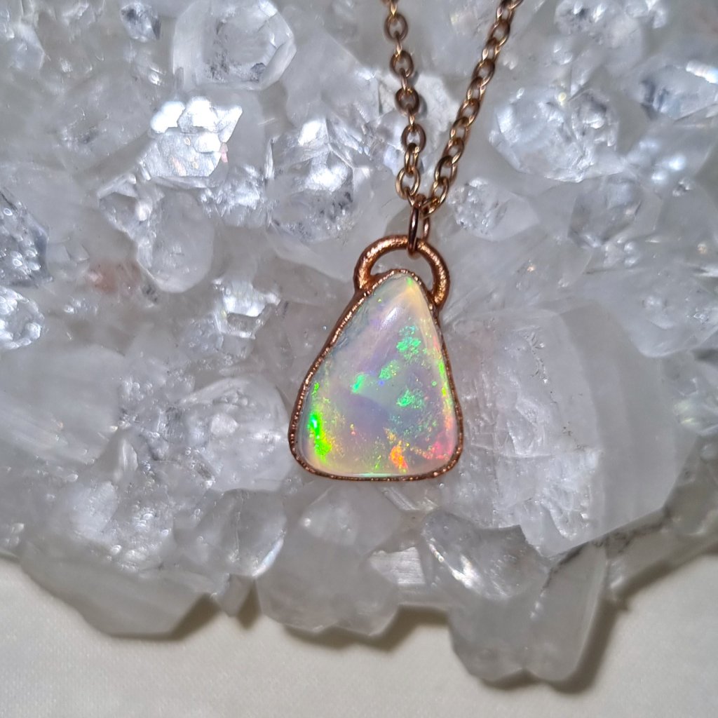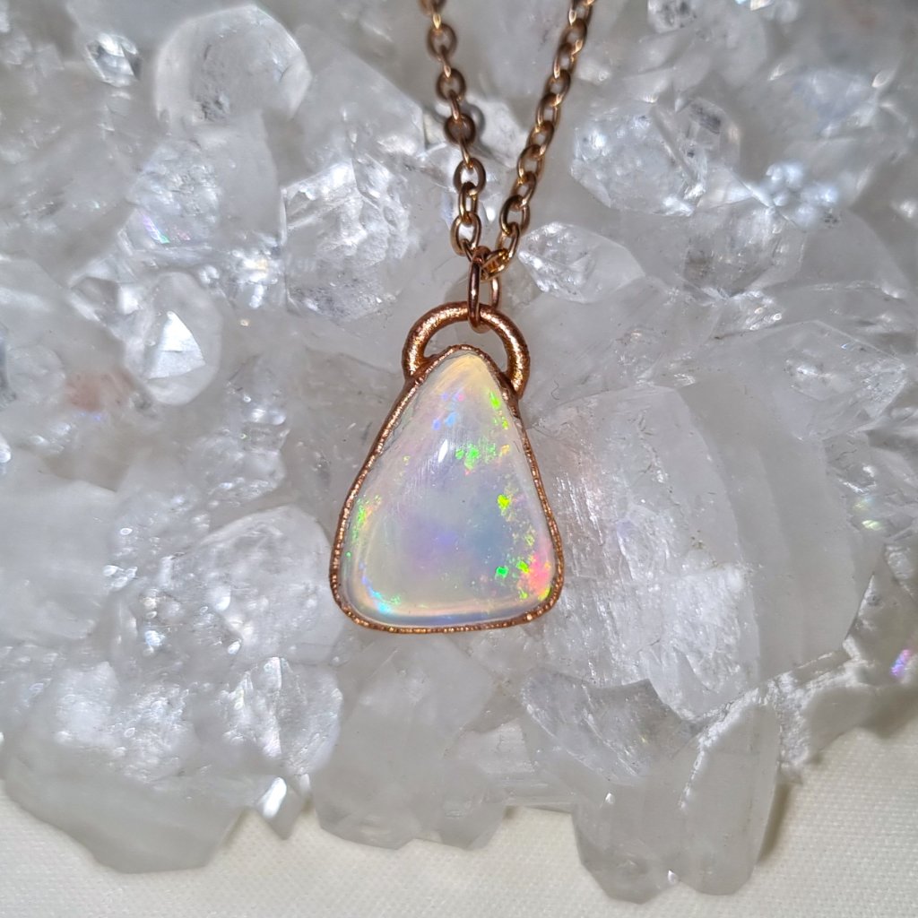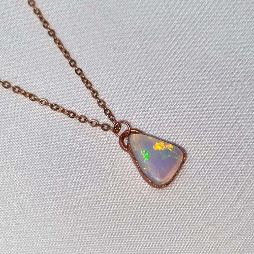 Měděný přívěsek tvoří přírodní etiopský opál, který hraje všemi barvami duhy (záleží na úhlu pohledu a prostupování světla). Bohužel tu krásu a intenzitu barev nelze zcela realisticky na foto zachytit.