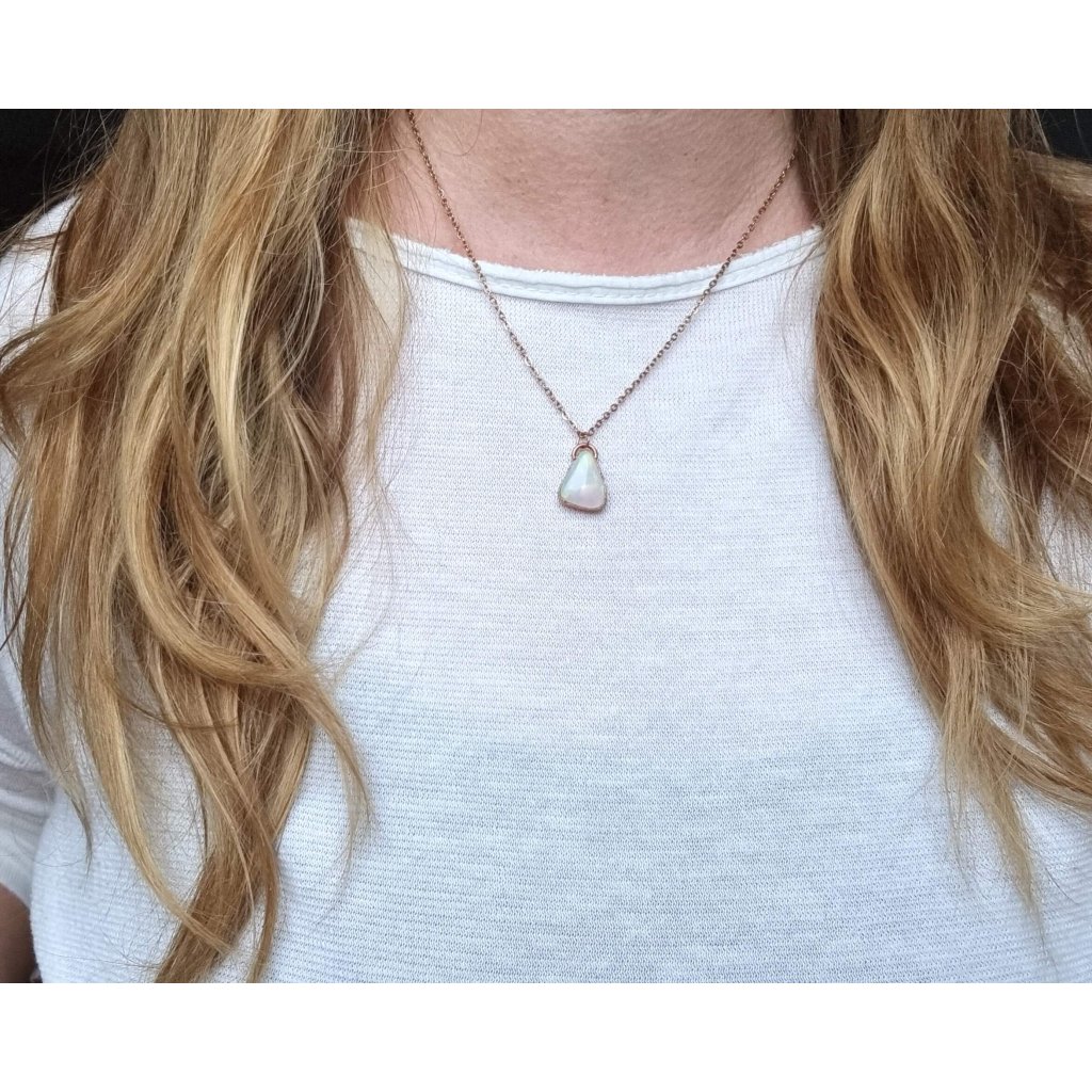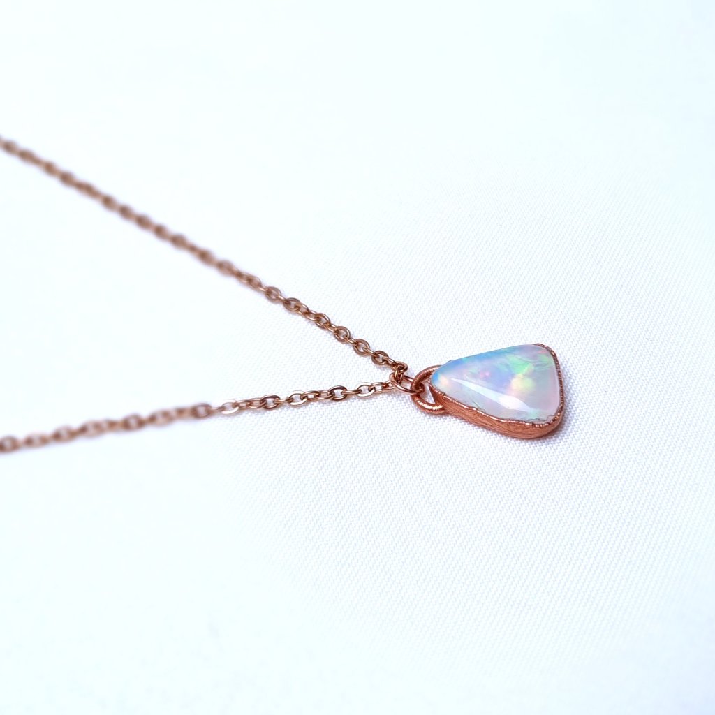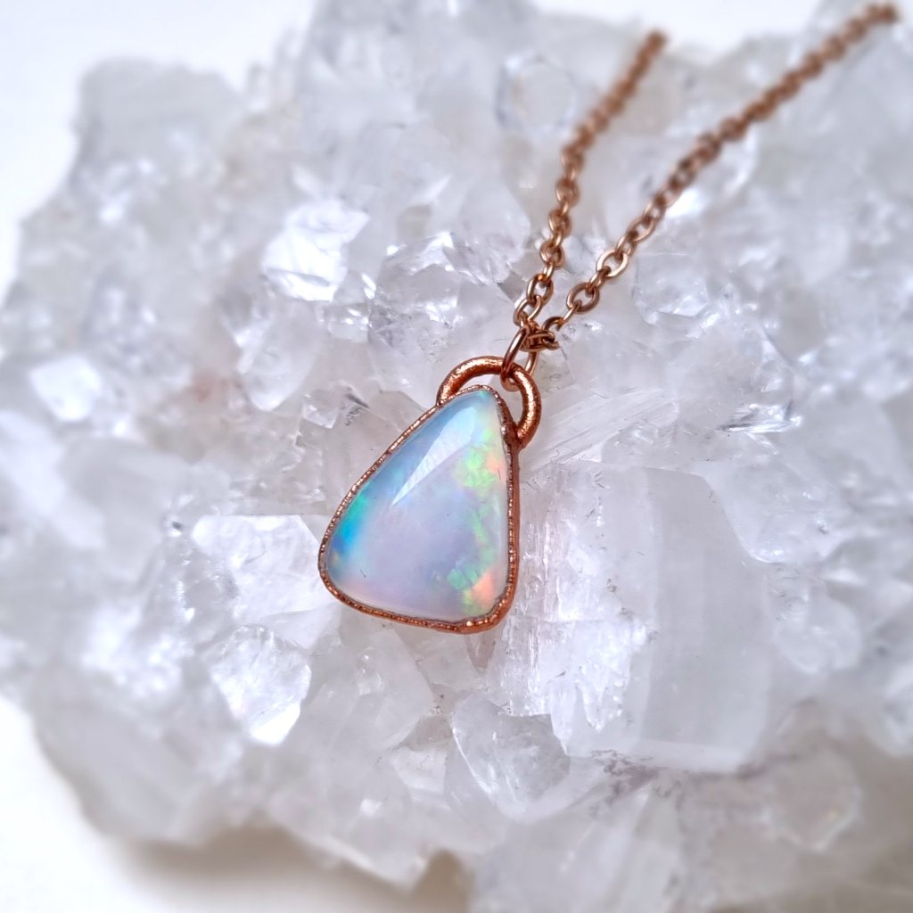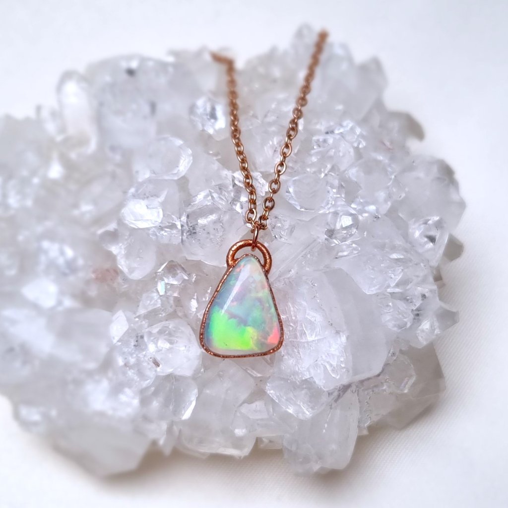 Měděný přívěsek tvoří přírodní etiopský opál, který hraje všemi barvami duhy (záleží na úhlu pohledu a prostupování světla). Bohužel tu krásu a intenzitu barev nelze zcela realisticky na foto zachytit.