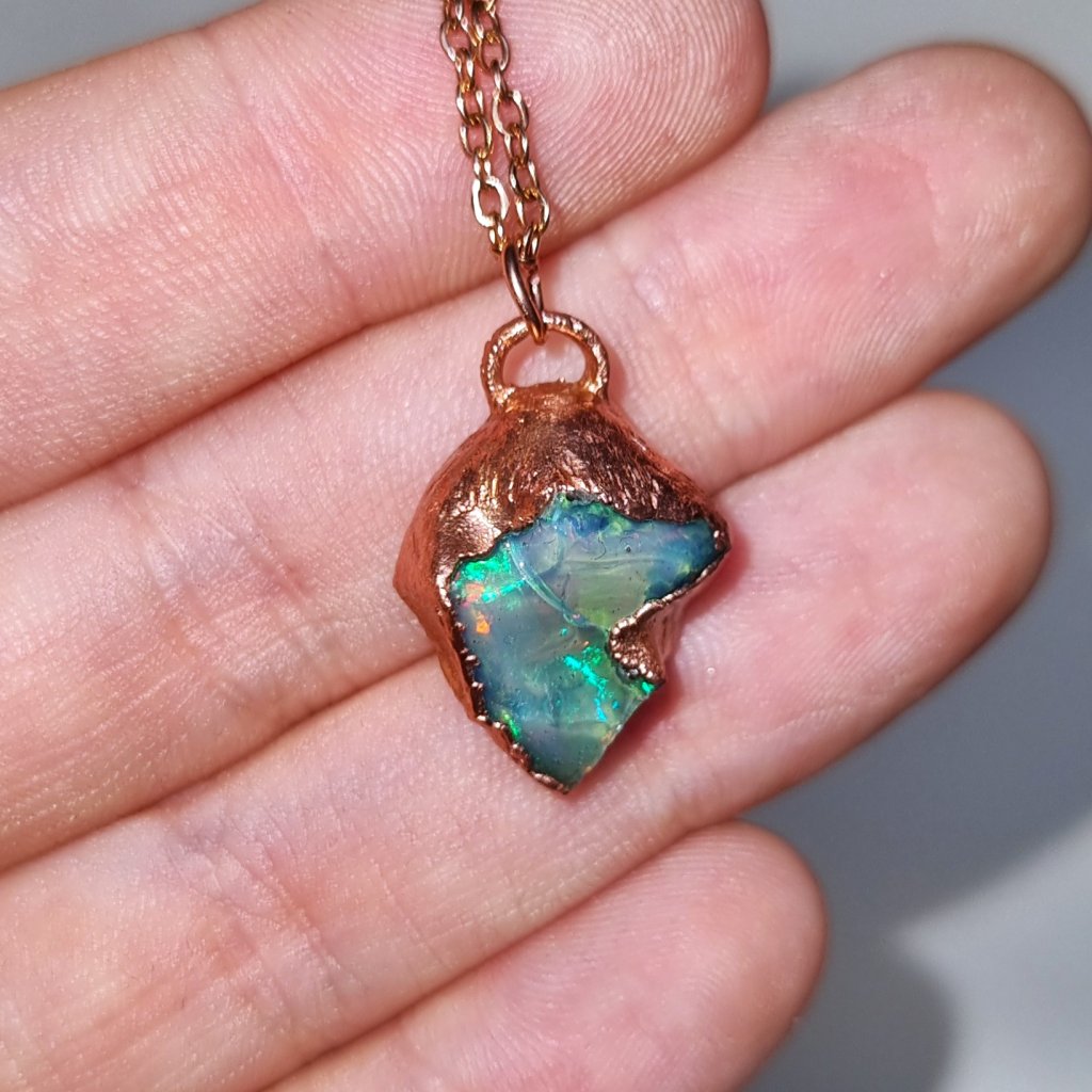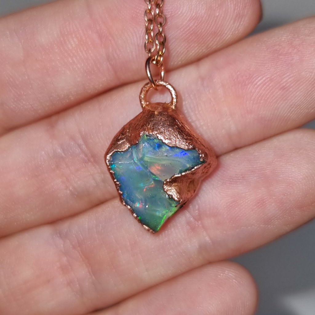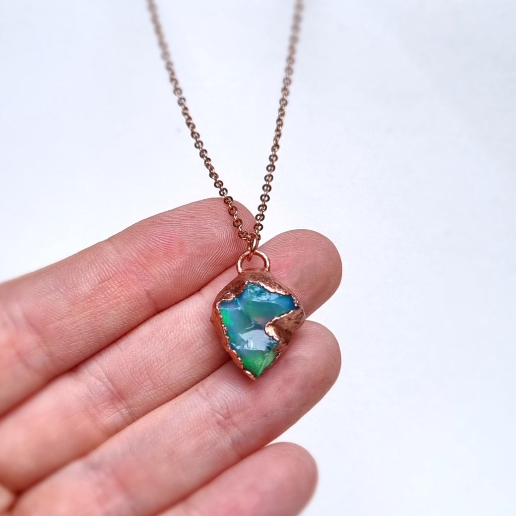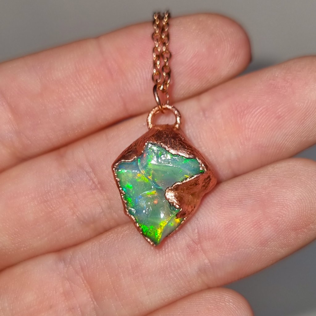 Měděný přívěsek tvoří přírodní neopracovaný (surový) etiopský opál, který hraje všemi barvami duhy (záleží na úhlu pohledu a prostupování světla). Bohužel tu krásu a intenzitu barev nelze zcela realisticky na foto zachytit.