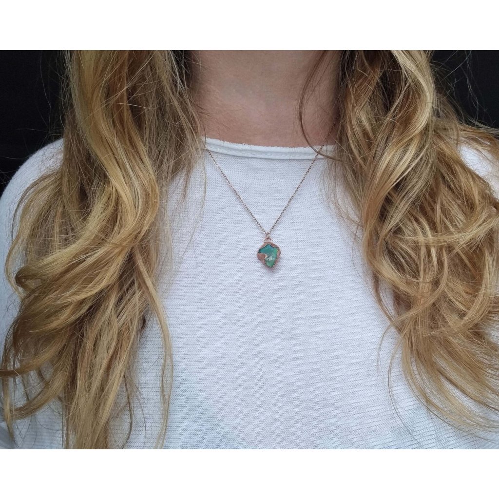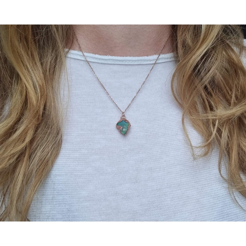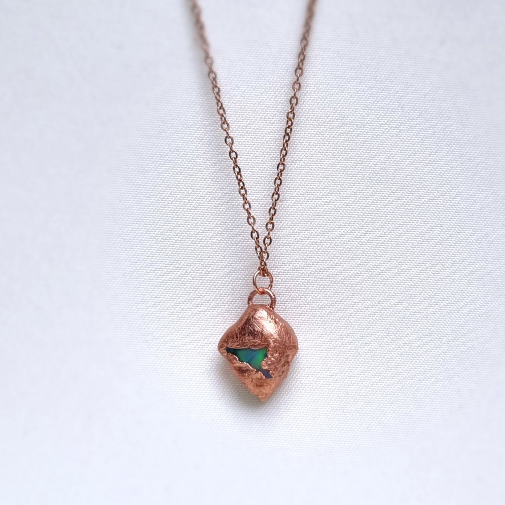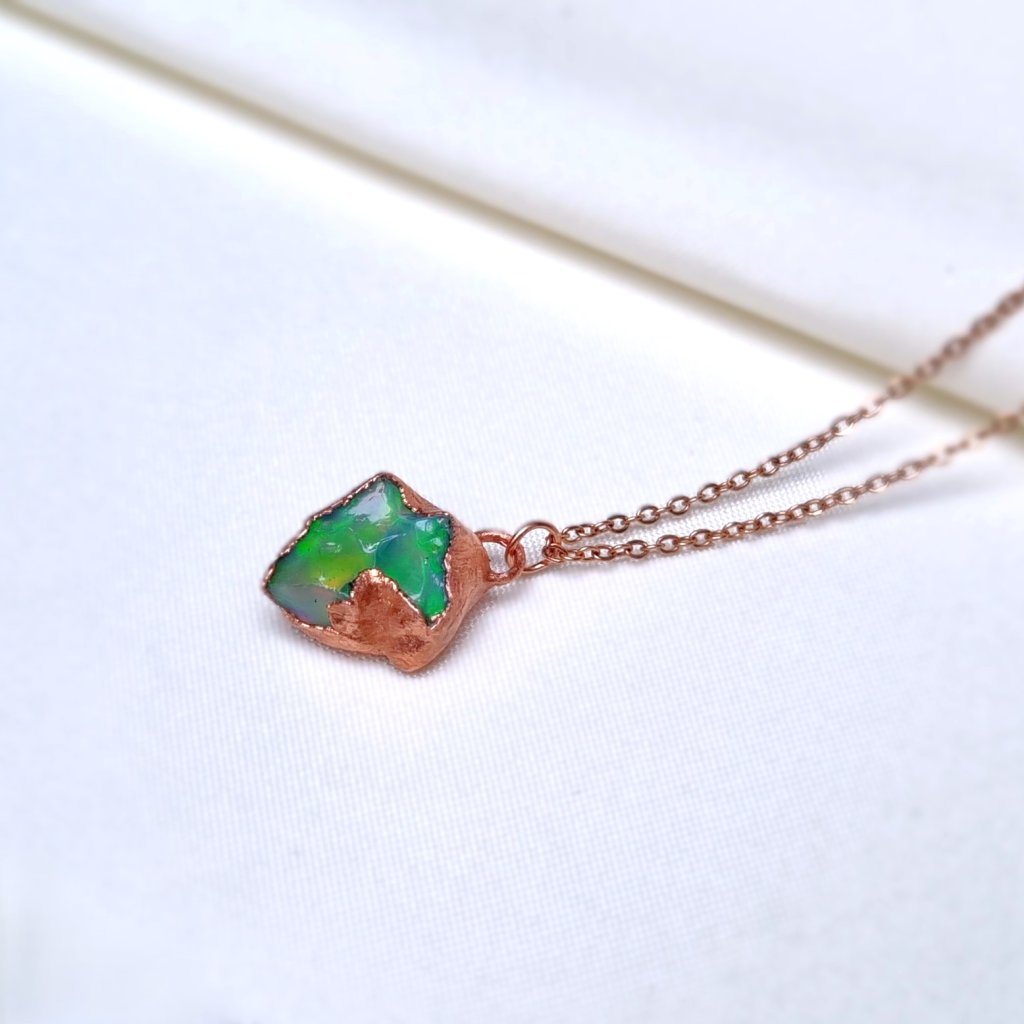 Měděný přívěsek tvoří přírodní neopracovaný (surový) etiopský opál, který hraje všemi barvami duhy (záleží na úhlu pohledu a prostupování světla). Bohužel tu krásu a intenzitu barev nelze zcela realisticky na foto zachytit.