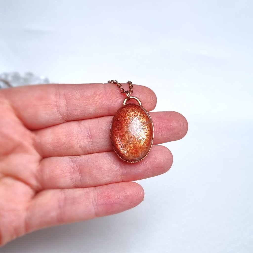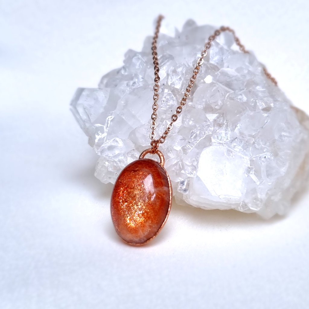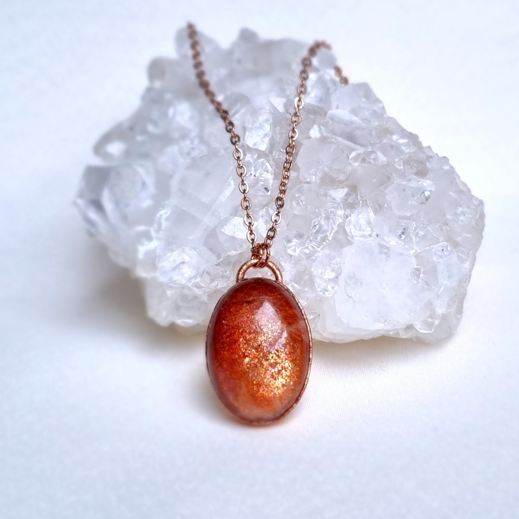 Pravý přírodní sluneční kámen - kámen zářící teplým, zlatavým světlem, jako by v sobě ukrýval poslední paprsek letního dne. Každý jeho odlesk je jako dotek radosti, života a vitality. Sluneční kámen je odpradávna považován za kámen životní energie a vnitřní síly. Prosvětluje stíny pochybností, probouzí odvahu následovat vlastní cestu a připomíná, že i v nejtemnější chvíli v tobě plane jiskra světla.