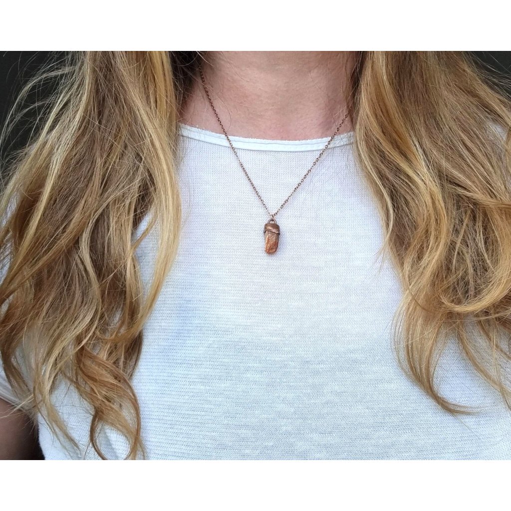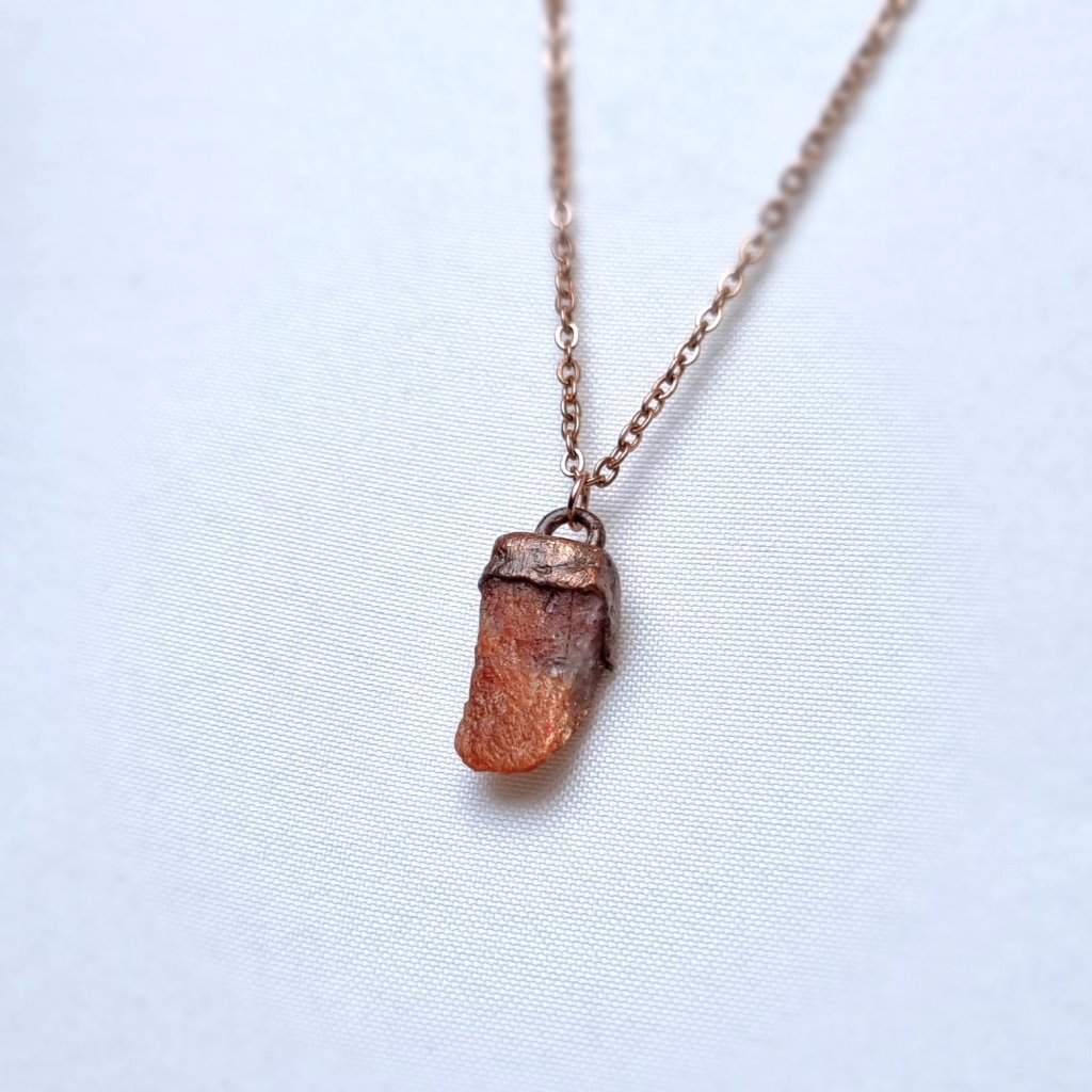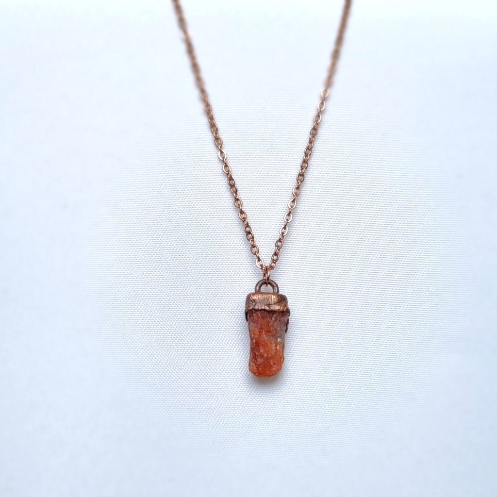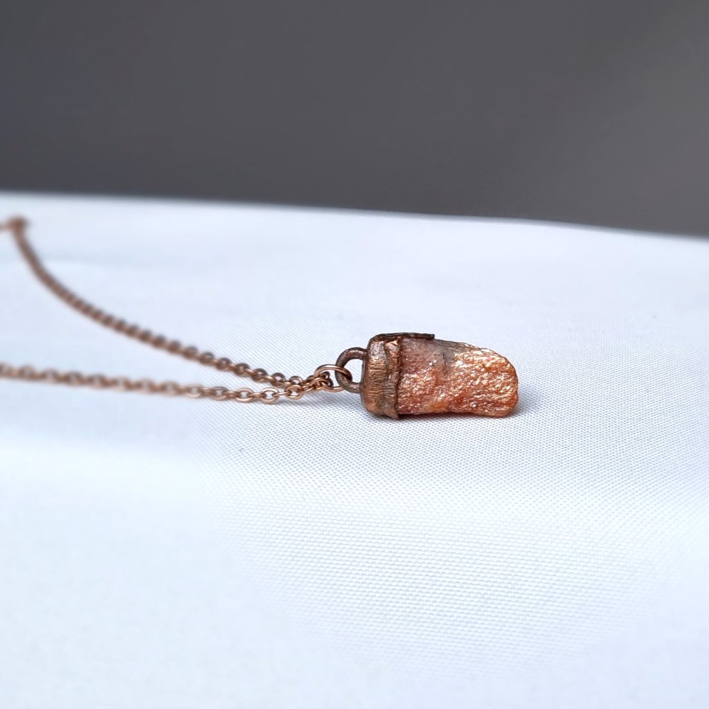 Tento šperk zdobí pravý, neopracovaný sluneční kámen (sunstone) pocházející z Indie.