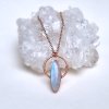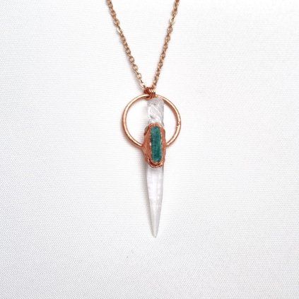 Tento šperk spojuje oboustranně ukončený krystal zeleného hiddenitu – vzácného drahokamu otevírajícího srdce – s jemnou energií měsíčního kamene, odvěkého průvodce ženské duše....