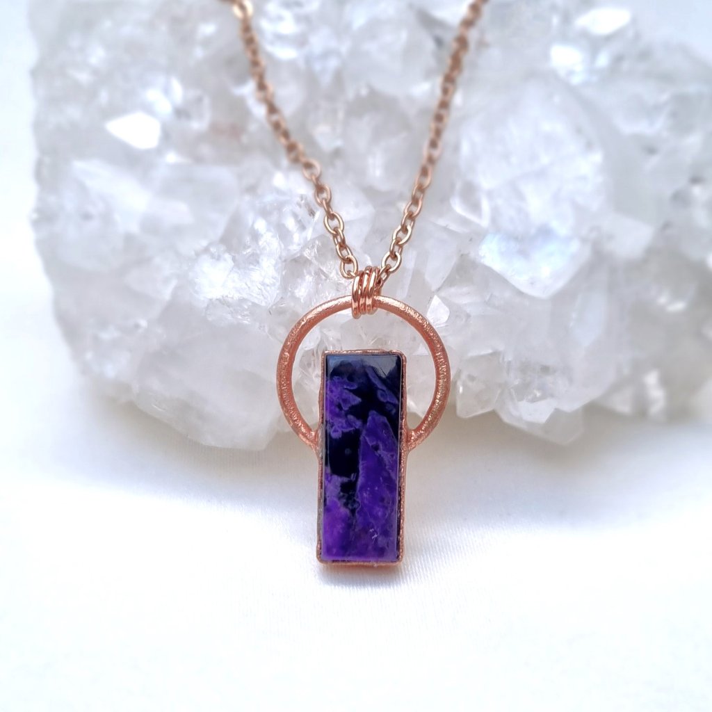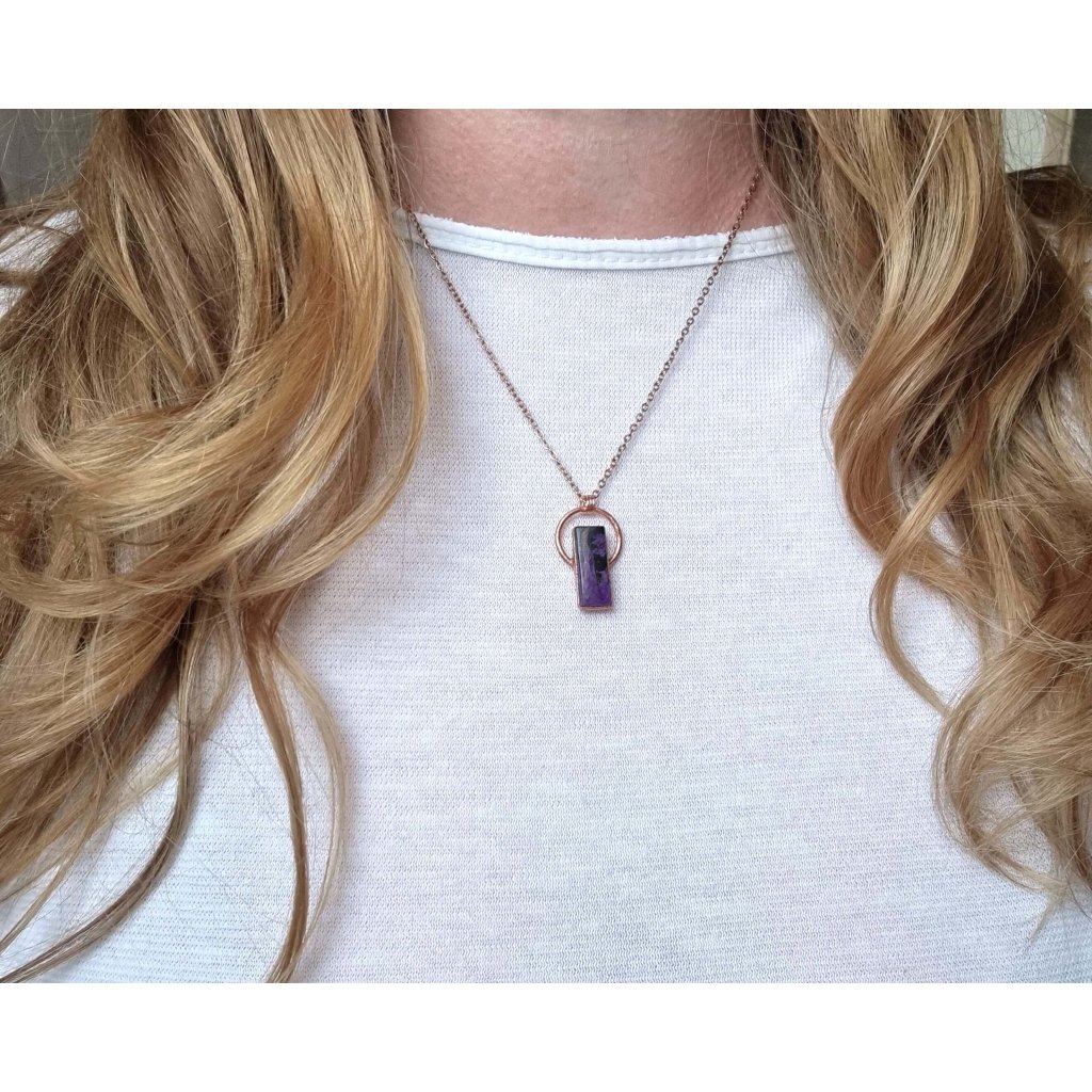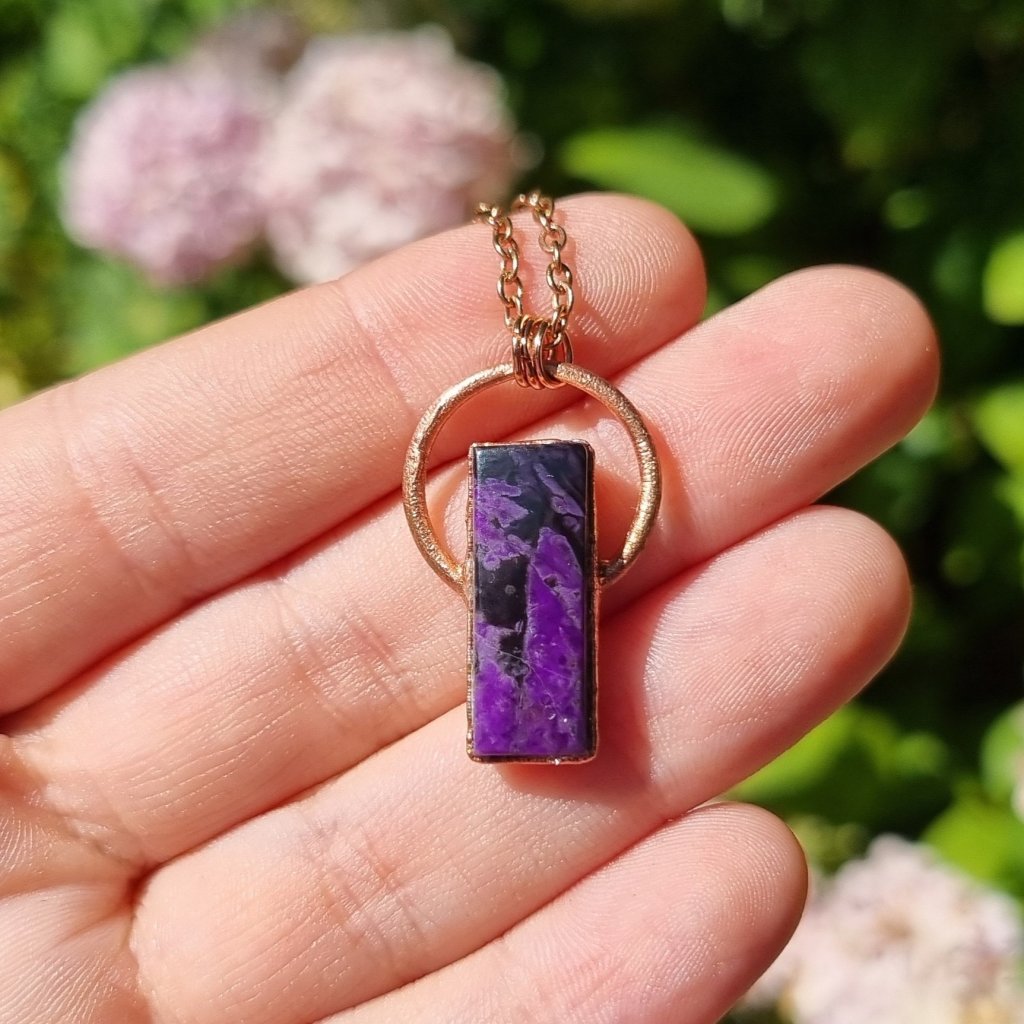 Měděný přívěsek se vzácným přírodním jasně fialovým sugilitem. Sugilit (také známý jako luvulit nebo lavulit) pochází z Jihoafrické republiky. Tyto sugility mají nejintenzivnější fialovou barvu.
