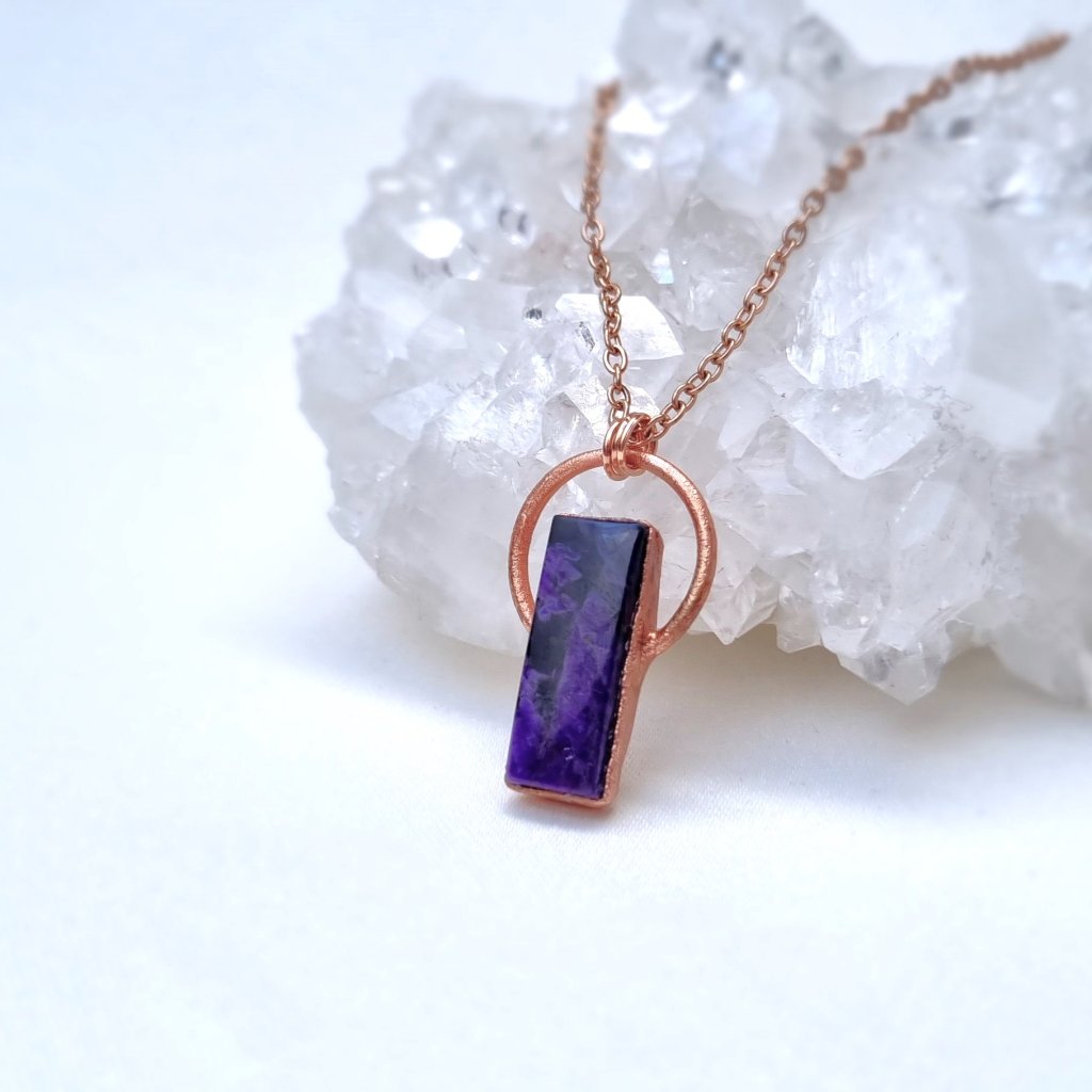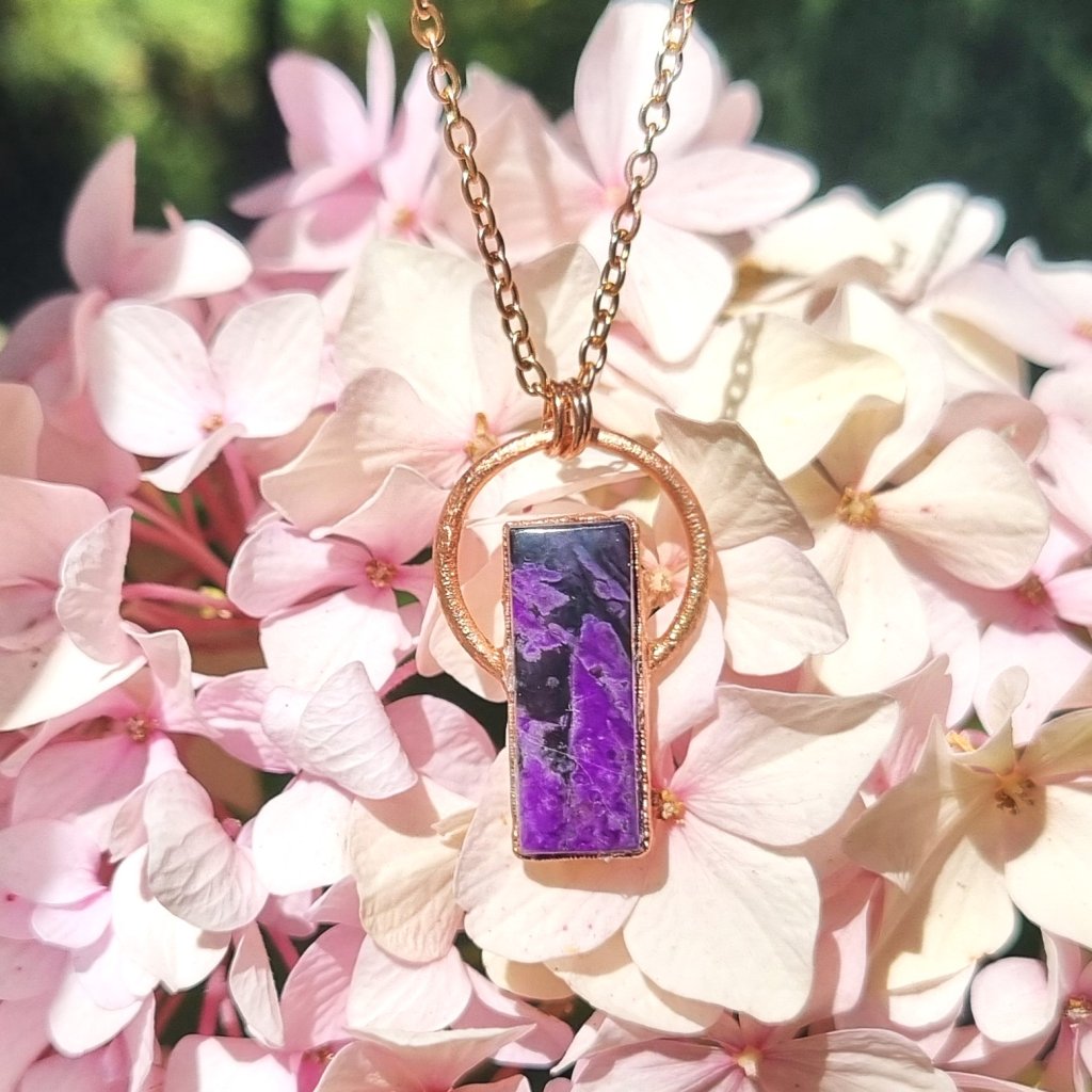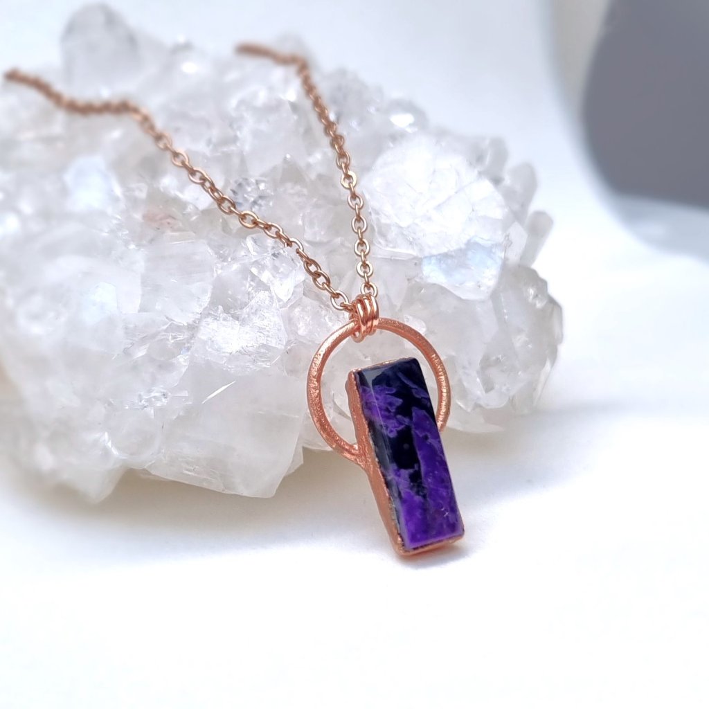 Měděný přívěsek se vzácným přírodním jasně fialovým sugilitem. Sugilit (také známý jako luvulit nebo lavulit) pochází z Jihoafrické republiky. Tyto sugility mají nejintenzivnější fialovou barvu.