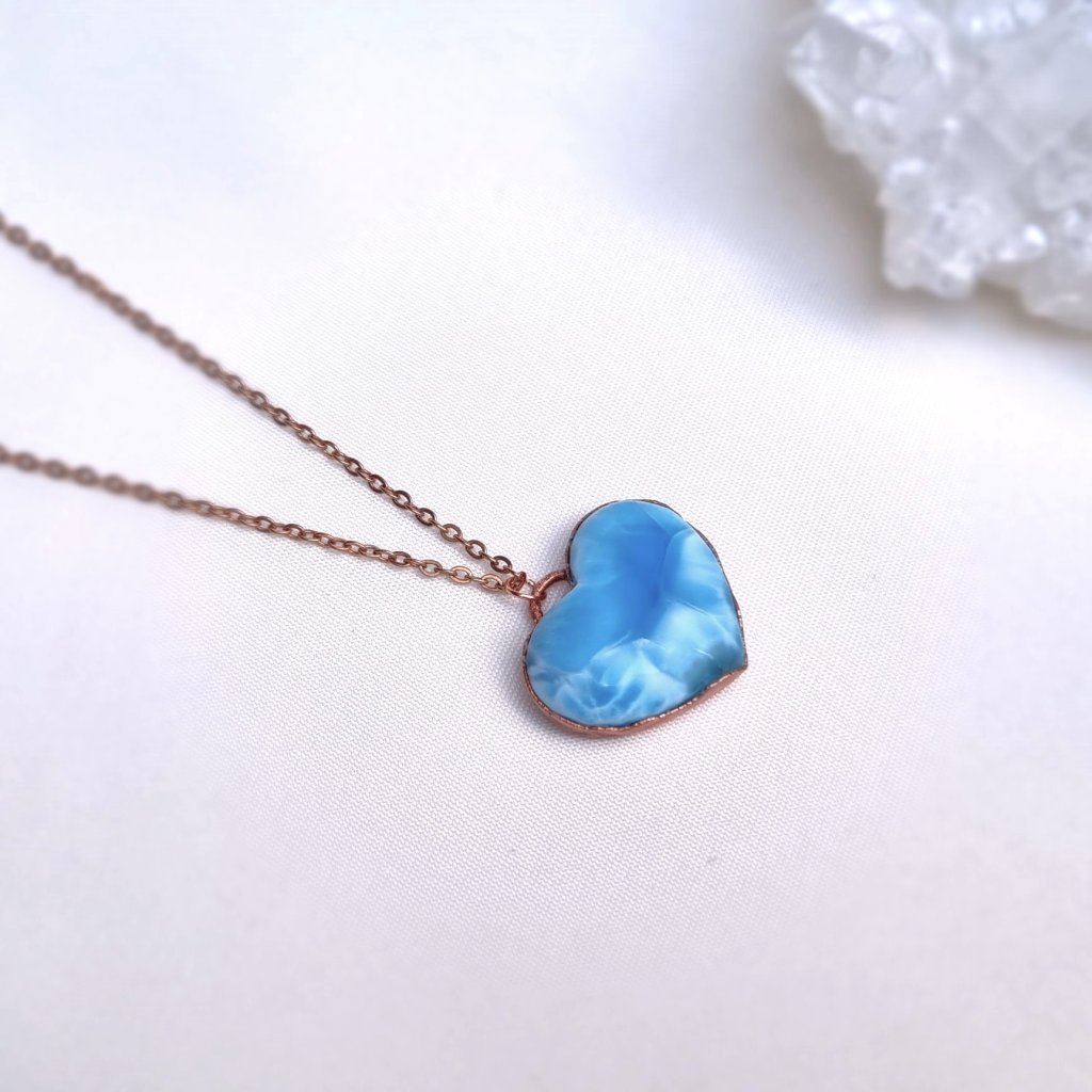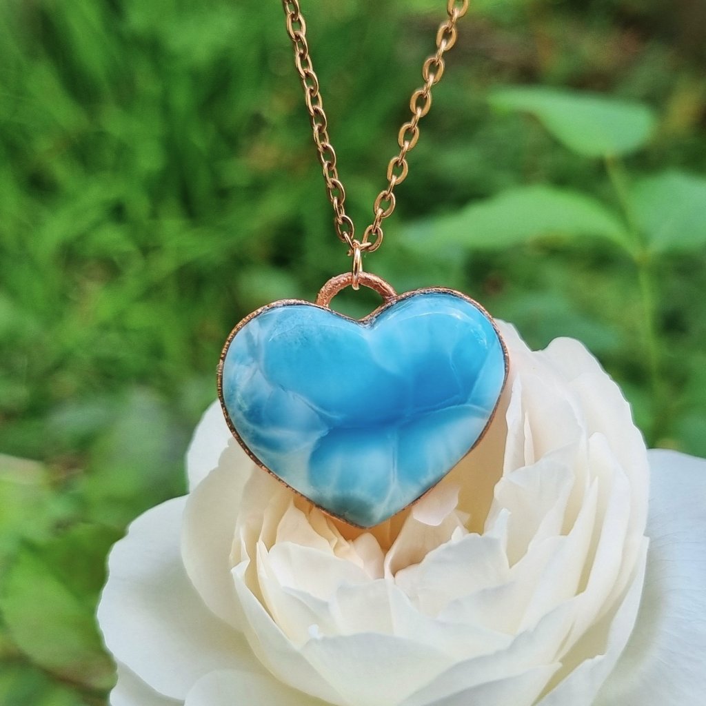 Měděný přívěsek s larimarem v té nejvyšší kvalitě, vybroušeného do tvaru srdce. Má nádhernou jasně modrou barvu (není dobarvován) a kresbu. Jeho energie je jako klidná vlna oceánu – tiší, harmonizuje a otevírá cestu k čisté radosti a jemné ženské síle. Ve tvaru srdce nese poselství lásky, soucitu a hlubokého spojení s vlastním nitrem. Vzácný larimar, znám také jako ,,Kámen delfínů", se nachází na jediném místě na světě - v Dominikánské republice. Psala jsem o něm také na blogu zde LARIMAR - POKLAD Z KARIBIKU