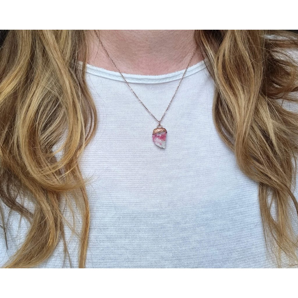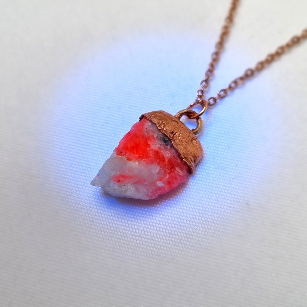 Tento autorský šperk je stvořen z jednoho z nejvzácnějších darů Země – malinově růžového tugtupitu, který se v této kvalitě nachází jen na jediném místě na světě - v Grónsku, oblasti Narsaq, Ilímaussaq. Opravdová rarita! Tugtupit je přírodní, neopracovaný a má sytě malinově růžovou barvu. Tugtupit reaguje na sluneční světlo změnou barvy a svítí pod UV lampou.