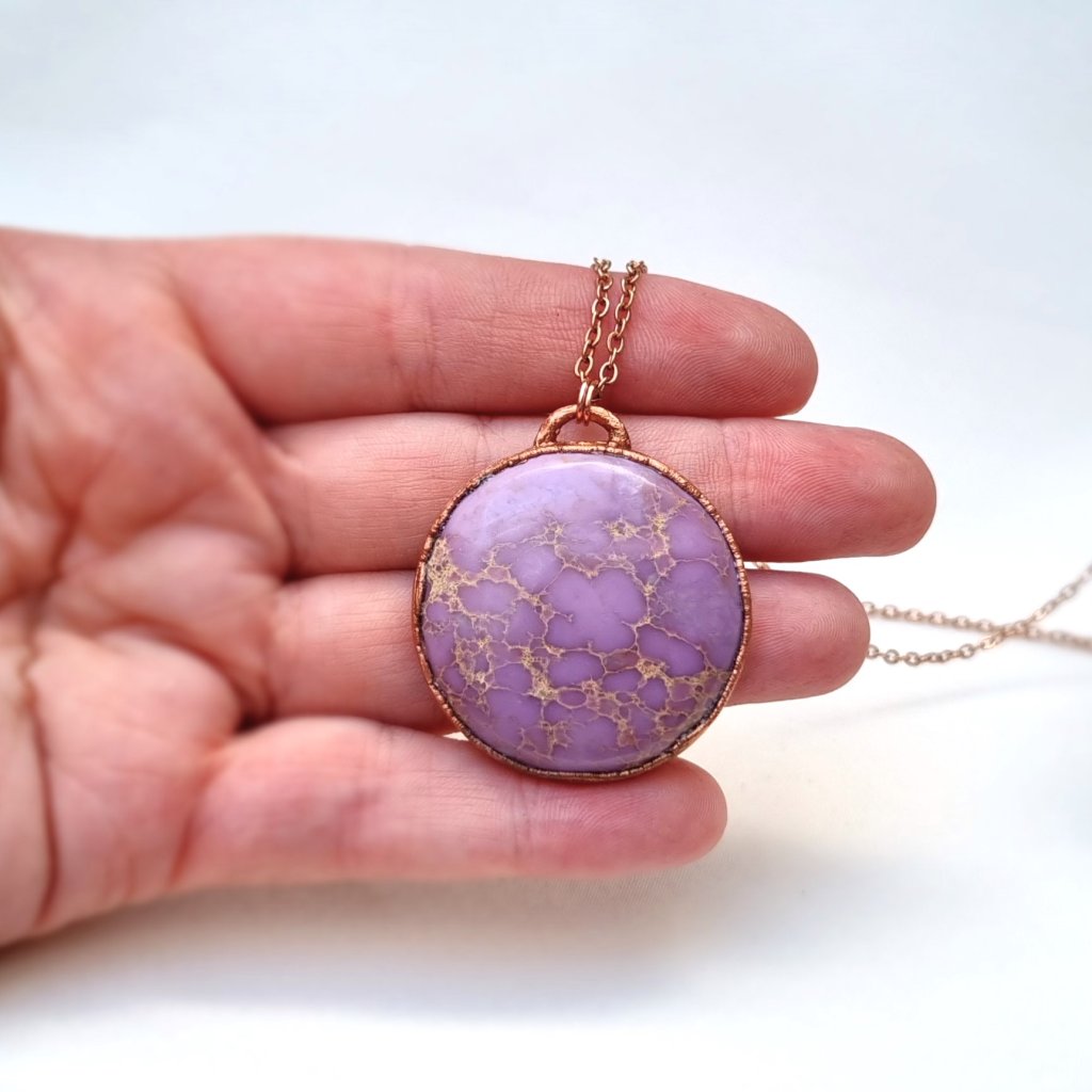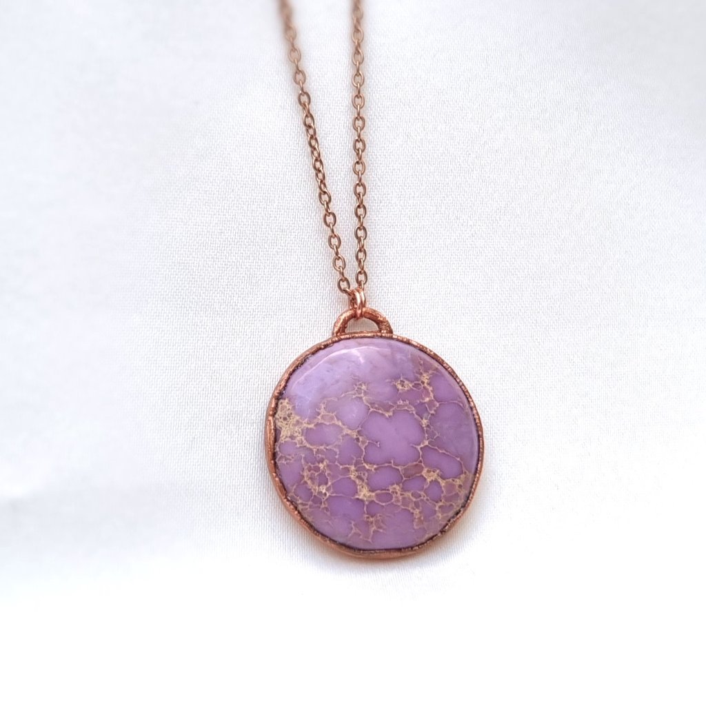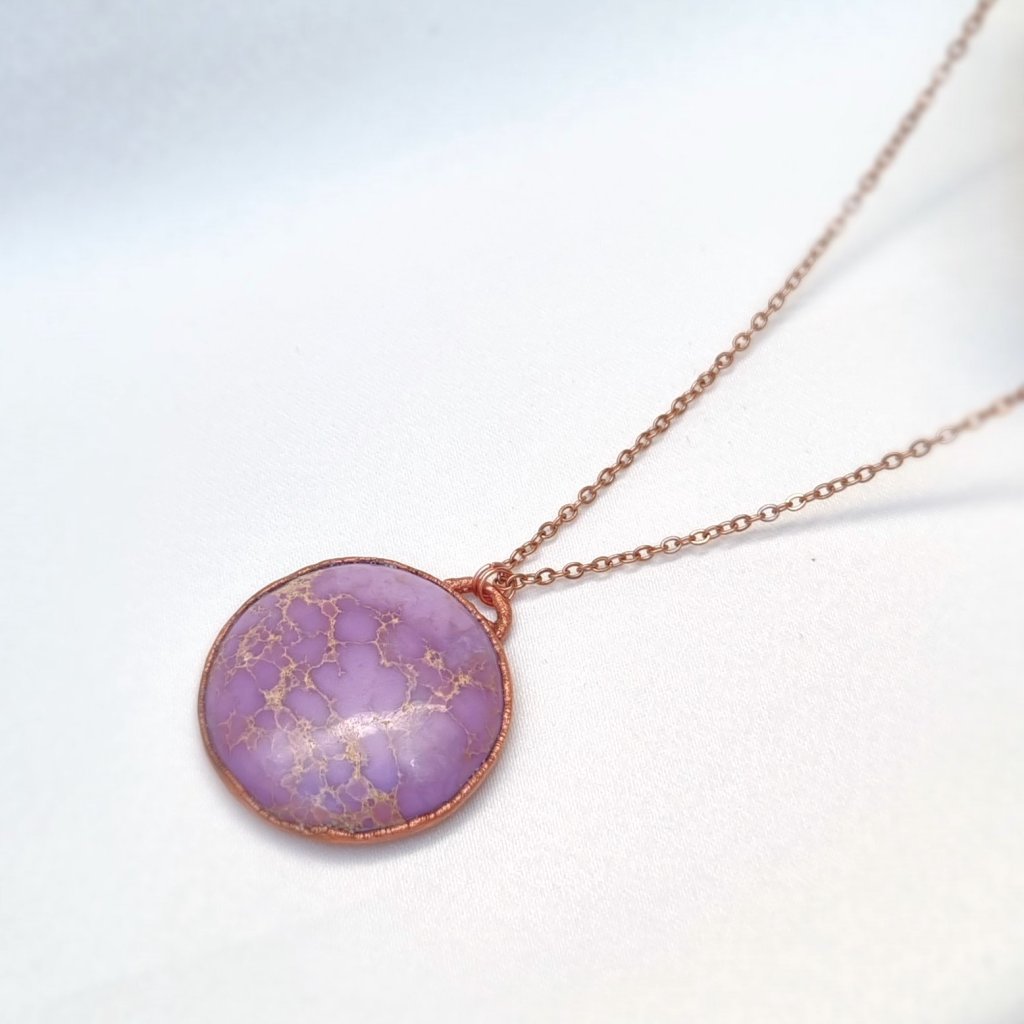 Unikátní měděný přívěsek se vzácným růžovo-fialovým fosfosideritem. Jeho zvláštností je, že částečně mění barvu dle typu osvětlení, někdy je zbarven více do růžové (denní světlo), někdy více do levandulové (umělé osvětlení).