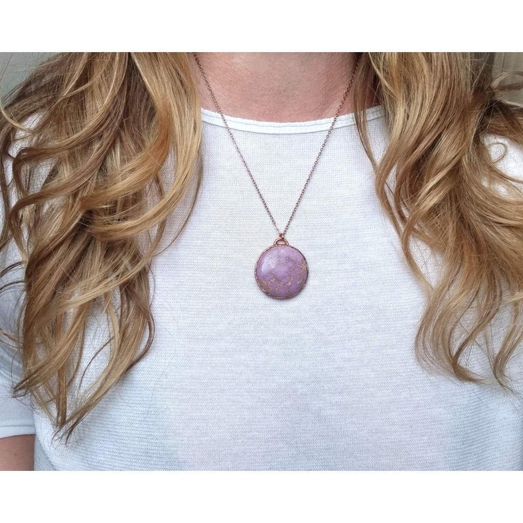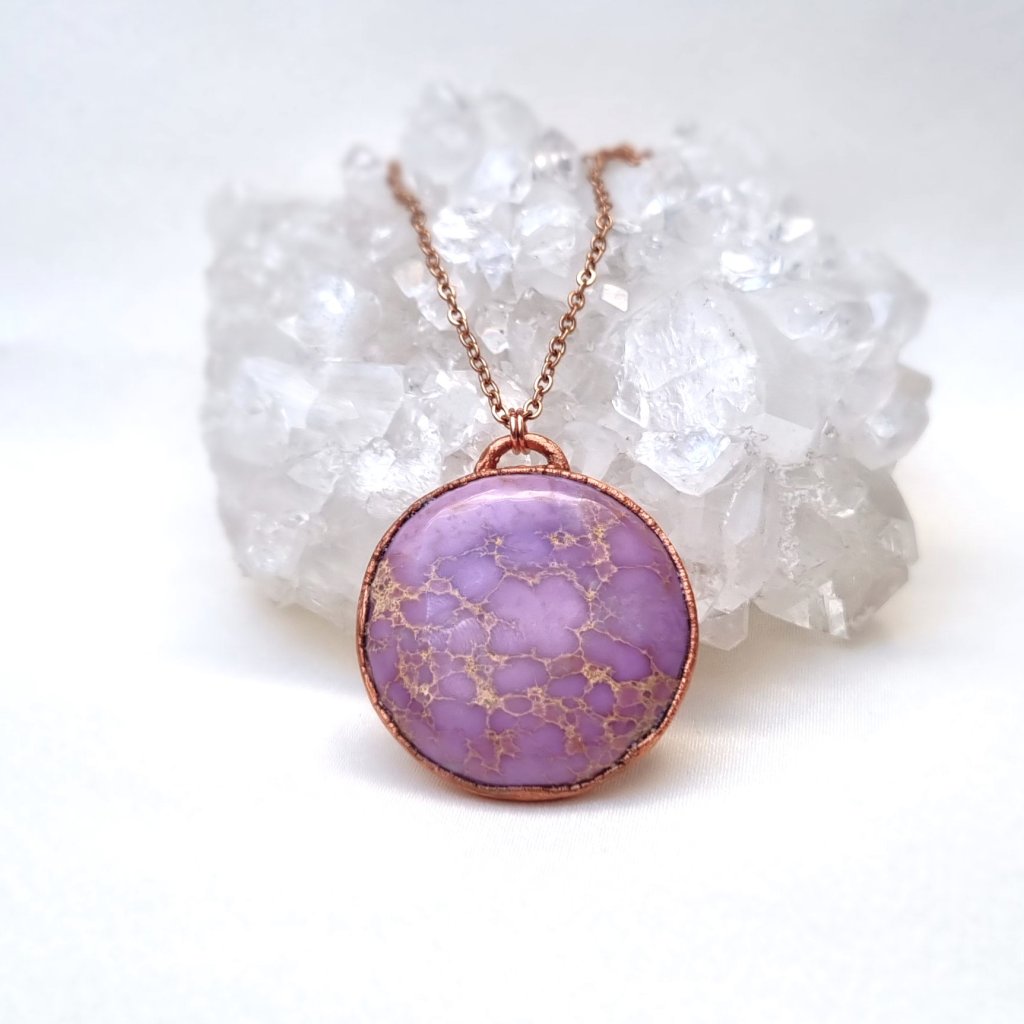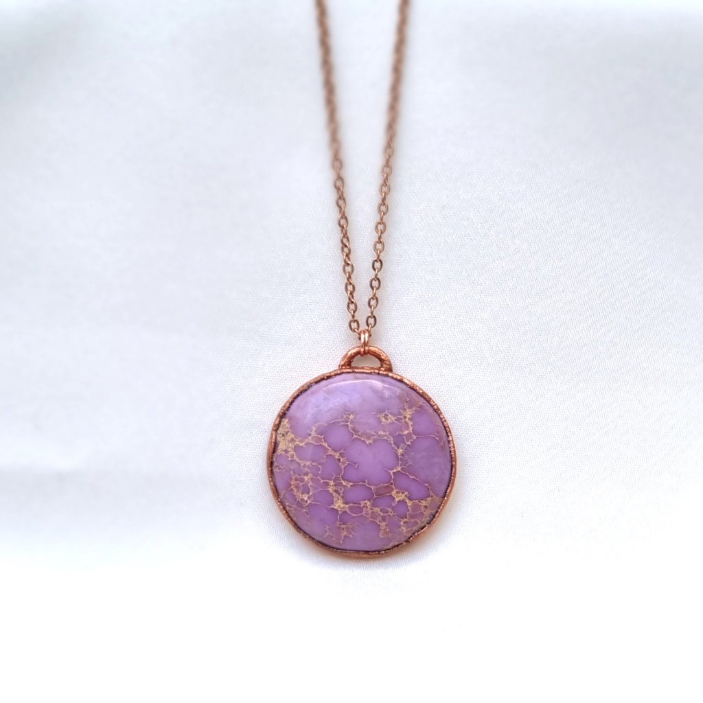 Unikátní měděný přívěsek se vzácným růžovo-fialovým fosfosideritem. Jeho zvláštností je, že částečně mění barvu dle typu osvětlení, někdy je zbarven více do růžové (denní světlo), někdy více do levandulové (umělé osvětlení).