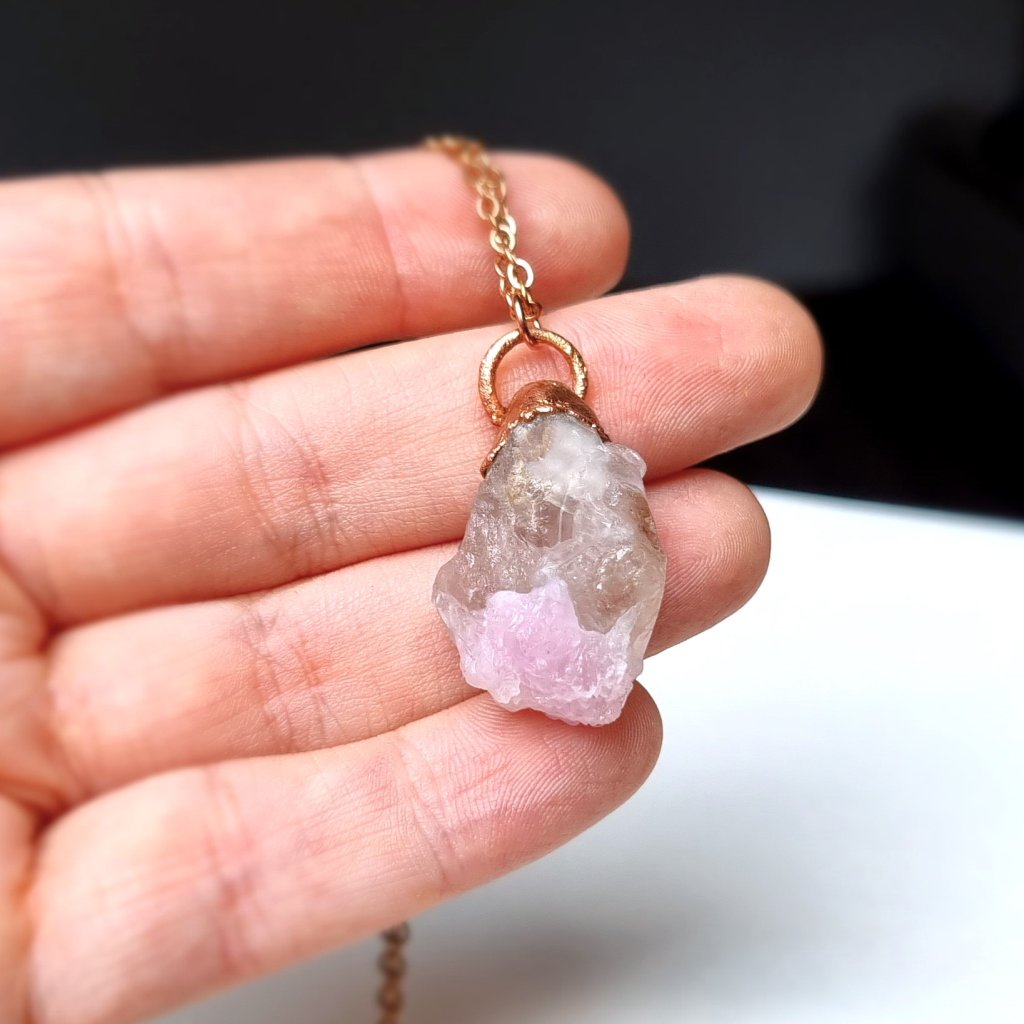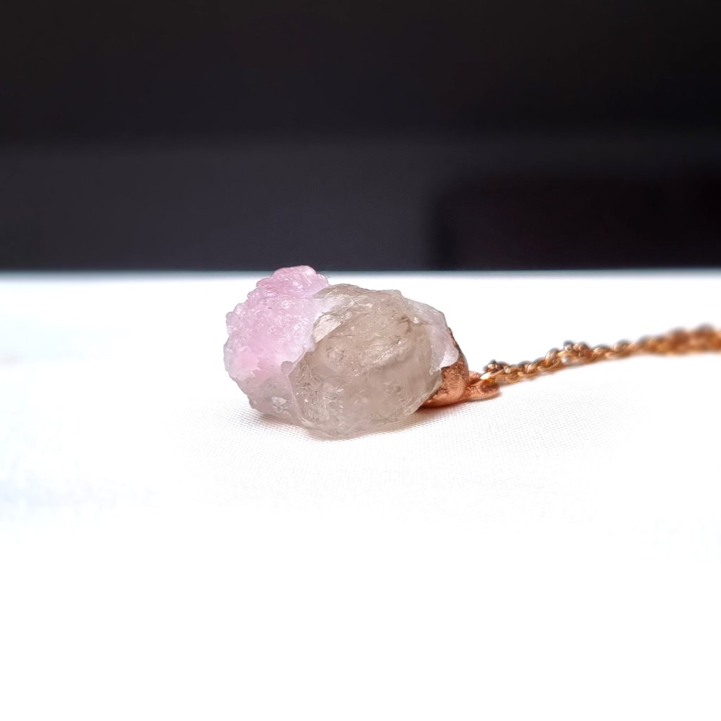 Vzácný KRYSTALICKÝ RŮŽENÍN - originální autorský šperk, který v sobě spojuje jemnost a lehkost růženínu a hlubokou sílu a stabilitu záhnědy. Krystalický růženín, kámen lásky a něhy, vyrůstá přímo na krystalu záhnědy, která přináší stabilitu, ochranu a ukotvení. Jejich propojení vytváří harmonii, něžnou i mocnou energii, která otevírá srdce a zároveň stojí pevně na Zemi.